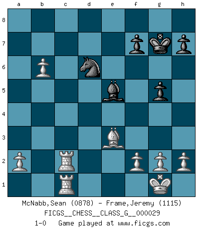 Last move : 1-0 2009 April 10 23:52:46 [Event "FICGS__CHESS__CLASS_G__000029"] [Site "FICGS"] [Date "2009.03.21"] [Round "1"] [White "McNabb,Sean"] [Black "Frame,Jeremy"] [Result "1-0"] [WhiteElo "0878"] [BlackElo "1115"] 1.d4 d5 2.c4 c6 3.Nc3 Nf6 4.e3 Bf5 5.Nf3 Nbd7 6.Bd3 e6 7.O-O Be7 8.Qb3 Qc8 9.Bxf5 exf5 10.c5 b6 11.cxb6 axb6 12.Ne5 O-O 13.Re1 Qc7 14.Na4 Nxe5 15.dxe5 Nd7 16.Bd2 Nc5 17.Qxb6 Qxb6 18.Nxb6 Rab8 19.Nd7 Rfd8 20.Nxb8 Rxb8 21.b3 g5 22.Bc3 Ne4 23.Bd4 c5 24.Bb2 c4 25.Red1 c3 26.Bc1 Bb4 27.Rxd5 Rc8 28.Rb5 Be7 29.b4 f4 30.Rb7 fxe3 31.Bxe3 Bf8 32.b5 c2 33.b6 Bg7 34.Rc7 Bxe5 35.Rxc8+ Kg7 36.Rc1 Nd6 37.R8xc2 1-0 QGD Slav defense Kingside Castling by player White (move 7) Kingside Castling by player Black (move 12) Player White won this chess game. Follow this game move after move (download)In Chess, as it is played by masters, chance is practically eliminated. (Emanuel Lasker) Er war ein guter Schachspieler, aber ich kann Leute nicht ausstehen, die 'Heil Hitler' rufen (Über Alexander Aljechin). (Miguel Najdorf) Sin errores no puede haber brillantez. (Emanuel Lasker) Votre prénom est 'Tactique', votre deuxième prénom est 'Tactique' et votre nom est 'Tactique'. (Ken Smith) When I took office, only high energy physicists had ever heard of what is called the World Wide Web... Now even my cat has its own page. (Bill Clinton, 1996)