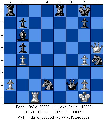 Last move : 0-1 2009 April 28 3:23:38 [Event "FICGS__CHESS__CLASS_G__000029"] [Site "FICGS"] [Date "2009.03.21"] [Round "1"] [White "Percy,Dale"] [Black "Moko,Seth"] [Result "0-1"] [WhiteElo "0956"] [BlackElo "1028"] 1.e4 e6 2.d3 Bc5 3.d4 Bb4+ 4.c3 Ba5 5.b4 Bb6 6.Na3 Nc6 7.Nc4 d5 8.Nf3 dxc4 9.Bxc4 Nf6 10.O-O O-O 11.b5 Na5 12.Bd3 c6 13.Ba3 Re8 14.e5 Ng4 15.Bxh7+ Kxh7 16.Qd3+ Kg8 17.h3 Nh6 18.Rab1 f6 19.Qg6 Nc4 20.Bb4 a5 21.Rfe1 fxe5 22.Nxe5 Nd2 23.Rbc1 axb4 24.cxb4 cxb5 25.Nd3 Nf5 26.Rxe6 Bxe6 27.Ne5 Qxd4 28.Ng4 Nh4 29.Qh5 Bxg4 30.hxg4 Qxf2+ 0-1 French : King's Indian attack Kingside Castling by player White (move 10) Kingside Castling by player Black (move 10) Player Black won this chess game. Follow this game move after move (download)Adequate compensation for a sacrifice is having a sound combination leading to a winning position; adequate compensation for a blunder is having your opponent snatch defeat from the jaws of victory. (Bruce A. Moon) Der Umstand, daß uns eine 7 Stunden Zeitkontrolle ermöglicht eine großartige, tiefe Partie zu spielen, ist für die Massenmedien nicht weiter von Bedeutung. (Alexej Shirov) El Ajedrez es el arte del análisis. (Mikhail Botvinnik) Le joueur d'Echecs qui veut atteindre le top est obligé de développer son propre credo créatif. Alexeï Stepanovicth Souétine. Il est facile d'écrire des livres ! Ce qui est difficile, c'est de jouer ! (Alexeï Stepanovicth Souétine) Whoever said the pen is mightier than the sword obviously never encountered automatic weapons. (US General Douglas MacArthur)