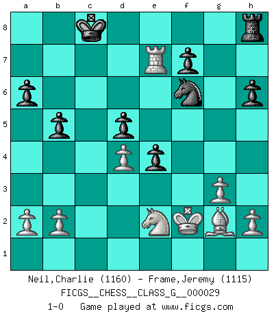 Last move : 1-0 2009 April 15 16:22:59 [Event "FICGS__CHESS__CLASS_G__000029"] [Site "FICGS"] [Date "2009.03.21"] [Round "1"] [White "Neil,Charlie"] [Black "Frame,Jeremy"] [Result "1-0"] [WhiteElo "1160"] [BlackElo "1115"] 1.c4 e5 2.g3 c6 3.Bg2 d5 4.cxd5 cxd5 5.Nc3 Nf6 6.d4 e4 7.Bg5 Be7 8.e3 Nbd7 9.Nge2 b6 10.Nf4 Bb7 11.O-O h6 12.Bxf6 Nxf6 13.Qa4+ Qd7 14.Qxd7+ Kxd7 15.Rfc1 g5 16.Nb5 gxf4 17.Rc7+ Kd8 18.Rxb7 fxe3 19.Rc1 exf2+ 20.Kxf2 a6 21.Nc3 b5 22.Ne2 Rc8 23.Rxc8+ Kxc8 24.Rxe7 1-0 English Opening Kingside Castling by player White (move 11) Player White won this chess game. Follow this game move after move (download)The hardest game to win is a won game. (Emanuel Lasker) Ja, ich habe einmal eine Blitzpartie gespielt, es war in einem Zug, 1929. --im Interview 1989 (Mikhail Moiseyevich Botvinik) La estratégia requiere pensar, la táctica requiere observación. (Max Euwe) Echiquier : carré parfait, comme la Jérusalem nouvelle décrite par l'auteur de l'Apocalypse, huit cases sur huit, exaltation du chiffre 4, symbole du cosmos aux quatre horizons... où le noir et le blanc, l'ombre et la lumière, le mal et le bien s'entremêlent et se conjuguent. (Robert Couffignal, Le Gambit du poète) The production of too many useful things results in too many useless people. (Karl Marx)