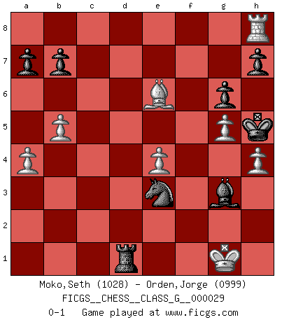 Last move : 0-1 2009 April 22 21:18:14 [Event "FICGS__CHESS__CLASS_G__000029"] [Site "FICGS"] [Date "2009.03.21"] [Round "1"] [White "Moko,Seth"] [Black "Orden,Jorge"] [Result "0-1"] [WhiteElo "1028"] [BlackElo "0999"] 1.d4 d5 2.Bf4 g6 3.Nf3 Bg7 4.e3 Nd7 5.Bd3 e6 6.Ne5 f6 7.Nxd7 Qxd7 8.O-O Ne7 9.Nd2 O-O 10.c3 e5 11.dxe5 fxe5 12.Bg3 e4 13.Nxe4 dxe4 14.Bc4+ Kh8 15.Qxd7 Bxd7 16.Rad1 Rad8 17.Bxc7 Rde8 18.Rxd7 Nc6 19.Bd6 Rd8 20.Bxf8 Rxd7 21.f3 Bxf8 22.fxe4 Bg7 23.h4 Ne5 24.Be6 Rd2 25.b4 Ng4 26.a4 Bxc3 27.b5 Nxe3 28.Rf8+ Kg7 29.Rc8 Be5 30.Rg8+ Kh6 31.g4 Bg3 32.g5+ Kh5 33.Rh8 Rd1+ 0-1 Queen's pawn, Mason variation Kingside Castling by player White (move 8) Kingside Castling by player Black (move 9) Player Black won this chess game. Follow this game move after move (download)I don't believe in psychology. I believe in good moves. (Bobby Fischer) Glücklicherweise sind Großmeister Ruben Fines reine Schachbücher weniger phallozentrisch [als seine Schachpsychologie] und deswegen auch weniger lächerlich. (Nigel Short) El Ajedrez tiene tanto misterio como las mujeres. (Purdy) La tactique est l'élément le plus important du milieu de jeu. (Siegbert Tarrasch) To be champion requires more than simply being a strong player; one has to be a strong human being as well. (Anatoly Karpov)