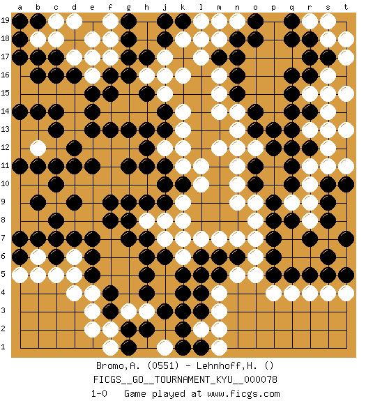 Last move : 1-0 2009 June 9 23:44:49 [Event "FICGS__GO__TOURNAMENT_KYU__000078"] [Site "FICGS"] [Date "2009.03.22"] [Round "1"] [Black "Bromo,Alexis"] [White "Lehnhoff,Heinz-Georg"] [Result "1-0"] [Rating 1 "0551"] 1.q16 d4 2.k10 q4 3.d16 d10 4.q10 k16 5.k4 e8 6.g7 j8 7.h9 f10 8.g13 f12 9.e13 e12 10.d12 g12 11.h12 f11 12.d11 e10 13.c10 c9 14.c11 b10 15.b11 a9 16.g11 g10 17.h11 h10 18.j10 k12 19.j11 l11 20.g9 e9 21.f8 h8 22.j9 k8 23.e7 d8 24.d7 c7 25.c6 b6 26.b7 b8 27.c8 d6 28.c7 c5 29.e6 d5 30.a7 a8 31.a11 a10 32.b9 k9 33.h13 d13 34.f13 d14 35.e14 d15 36.e15 c15 37.c16 b15 38.b16 a15 39.c13 e16 40.c14 a16 41.b17 b12 42.b14 b18 43.a17 b5 44.f9 e17 45.a14 m12 46.e5 e4 47.f4 e2 48.f3 f2 49.e11 l10 50.f16 f17 51.g17 f18 52.g18 f19 53.g19 c18 54.d18 d17 55.c17 d19 56.a18 e18 57.b19 c19 58.a19 e3 59.d9 a5 60.g2 f1 61.g1 h16 62.h17 j17 63.j18 k18 64.g16 j16 65.f15 k13 66.h15 j15 67.j14 k14 68.n16 l17 69.m17 m18 70.n18 m16 71.n17 m15 72.n15 n14 73.o14 n13 74.o13 o12 75.p12 n12 76.o11 n11 77.o10 o8 78.n6 n9 79.p8 o9 80.p9 o7 81.p7 o6 82.p6 o5 83.p5 p4 84.q5 r4 85.r5 s4 86.s5 t4 87.t5 n10 88.p13 m14 89.h7 j7 90.j6 k6 91.k5 k7 92.l6 m7 93.m6 l7 94.l5 n5 95.m5 m4 96.l4 m3 97.l3 l2 98.k2 m2 99.l1 j5 100.h6 j4 101.j3 n7 102.k3 h3 103.h4 g3 104.h2 m1 105.k1 j1 106.h5 r11 107.q11 r10 108.r12 s12 109.s10 r9 110.s9 r8 111.s8 s7 112.r7 s11 113.s13 r13 114.q12 s14 115.r14 t13 116.q13 s13 117.s15 r15 118.q14 s16 119.r16 t15 120.q15 s15 121.s17 t11 122.t7 s18 123.r18 t17 124.r17 r19 125.q19 s19 126.q18 n19 127.o19 m19 128.o18 t9 129.s6 t8 130.t10 t18 131.q8 q9 132.k19 l19 133.j19 l18 134.a6 k11 135.j13 j12 136.g8 1-0 Here are the names of the openings (joseki) played in the four corners : Corner q16 : q16 l11 Hoshi (Hwajeom, Seongjeom, Xingwei`) 4-4 Point. The star or hoshi (4-4) point, emphasizing influence at the potential expense of territory. Player Black won this Go (weiqi, baduk) game. Follow this game move after move (download)The game plays itself, the players don't control it. (Pierre Audouard) I teach you to lie, cheat and steal, and as soon as my back's turned you wait in line ? (Gregory House, House M.D.)
