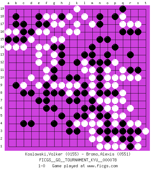 Last move : 1-0 2009 September 10 15:42:44 [Event "FICGS__GO__TOURNAMENT_KYU__000078"] [Site "FICGS"] [Date "2009.03.22"] [Round "1"] [Black "Koslowski,Volker"] [White "Bromo,Alexis"] [Result "1-0"] [Rating 1 "0155"] [Rating 2 "0551"] 1.d4 q10 2.q4 k4 3.d16 k16 4.q16 d10 5.m6 m5 6.k10 n7 7.o12 n13 8.n6 o6 9.o5 n4 10.m7 o7 11.p8 g7 12.n8 p6 13.q6 p5 14.o4 p4 15.p3 q5 16.h14 g13 17.r3 r4 18.n15 q3 19.o8 q7 20.n5 m4 21.n3 m3 22.q2 r6 23.g4 q8 24.j17 k17 25.g14 e14 26.f13 e13 27.k18 l18 28.e7 f14 29.f12 g12 30.g11 f11 31.h12 e12 32.j3 j18 33.m13 n12 34.o13 o11 35.p11 p10 36.h18 k19 37.n11 o10 38.m12 n14 39.m14 o14 40.p14 p12 41.o15 q11 42.h16 j16 43.j4 j5 44.h5 h6 45.k5 j6 46.l6 k6 47.l5 l4 48.f8 e9 49.g10 h17 50.f6 g15 51.f17 d15 52.c17 b16 53.b17 a16 54.g16 h15 55.h13 f16 56.b18 g17 57.e17 f18 58.e18 g18 59.q4 l7 60.k8 m8 61.o3 q3 62.l8 m9 63.n9 m10 64.n10 m11 65.q4 o9 66.c15 c14 67.b15 b14 68.a15 a14 69.c16 e16 70.c8 c9 71.r13 q3 72.s3 s4 73.s11 s10 74.r11 r10 75.n18 m17 76.n17 n2 77.o2 o1 78.k7 j8 79.d8 r17 80.j7 k9 81.l9 j9 82.c4 p1 83.q4 t3 84.k3 m2 85.r16 q17 86.s16 s17 87.q19 q18 88.p18 h7 89.h8 h9 90.g8 g9 91.f9 f10 92.j10 p2 93.q3 l11 94.k12 q1 95.b9 s2 96.f7 p9 97.r1 n1 98.r2 s1 99.g6 p7 100.n12 l12 101.l13 1-0 Here are the names of the openings (joseki) played in the four corners : Corner d4 : d4 g7 Hoshi (Hwajeom, Seongjeom, Xingwei`) 4-4 Point. The star or hoshi (4-4) point, emphasizing influence at the potential expense of territory. Player Black won this Go (weiqi, baduk) game. Follow this game move after move (download)On the second line six die, eight live. (Anonymous) Gambling is the son of avarice and the father of despair. (French proverb)
