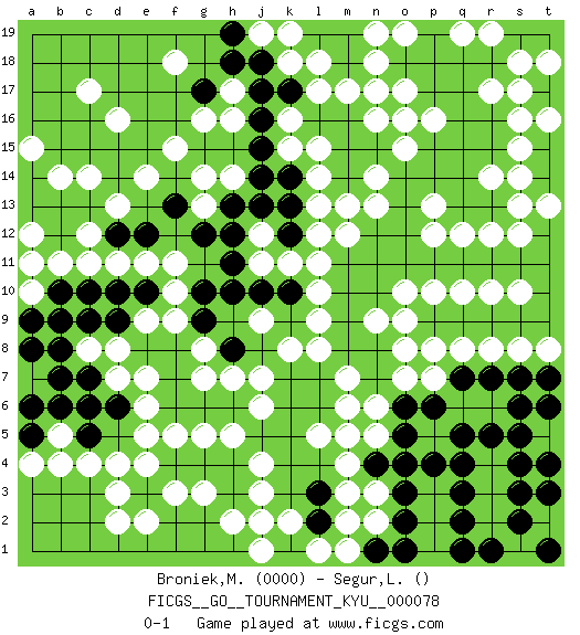 Last move : 0-1 2009 July 22 13:8:38 [Event "FICGS__GO__TOURNAMENT_KYU__000078"] [Site "FICGS"] [Date "2009.03.22"] [Round "1"] [Black "Broniek,Mariusz Maciej"] [White "Segur,Laurine"] [Result "0-1"] [Rating 1 "0000"] 1.q16 d4 2.q4 d16 3.k10 r6 4.r5 q6 5.q5 o17 6.p17 n16 7.o18 n18 8.o16 n17 9.p18 o19 10.p19 n19 11.n15 o15 12.p15 p16 13.o14 o16 14.m15 r14 15.q15 s15 16.p14 s16 17.r15 s14 18.s17 r17 19.r18 s18 20.t17 t18 21.r16 t16 22.q18 s17 23.q17 m13 24.m16 m17 25.l16 l17 26.k17 k16 27.j16 k15 28.j17 k18 29.j18 j19 30.h19 k19 31.h18 n14 32.m14 n13 33.o13 l14 34.q14 p12 35.q13 q12 36.o12 n11 37.o11 o10 38.p11 p10 39.q11 r12 40.r11 r10 41.r13 s12 42.t12 s13 43.s11 s10 44.t9 r19 45.t10 s8 46.s7 t8 47.s6 q10 48.n12 m12 49.s9 r8 50.r9 q8 51.q9 p8 52.p9 o9 53.n10 n9 54.m11 l10 55.m10 l9 56.l11 k11 57.k12 j11 58.m9 l8 59.n8 o8 60.m8 m6 61.n7 n6 62.p6 t13 63.t11 o7 64.o6 l12 65.n11 l13 66.k13 m7 67.k14 l15 68.j14 l18 69.t7 p5 70.r7 p13 71.q7 q19 72.j15 f15 73.d10 f18 74.o4 g13 75.e12 c8 76.o5 e11 77.p4 m4 78.m2 n3 79.o3 n2 80.o2 f11 81.n1 d11 82.c10 e9 83.d9 d8 84.c9 c11 85.e10 f10 86.e8 f9 87.f8 g8 88.f7 g7 89.n4 m3 90.l3 l5 91.l4 m5 92.k4 k2 93.l2 j3 94.j5 j4 95.k5 h5 96.h6 j6 97.k6 j7 98.h4 g5 99.f6 e5 100.g4 g3 101.f4 f3 102.g6 f5 103.h3 h2 104.k3 j2 105.l6 e6 106.e3 e4 107.b8 b9 108.b10 b7 109.a9 b11 110.a11 g16 111.c7 d7 112.c6 a7 113.d6 e7 114.k7 k8 115.l7 l1 116.k1 m1 117.o1 c14 118.b12 a8 119.b6 b9 120.g9 c4 121.b8 a6 122.a5 a7 123.g10 a13 124.b13 b14 125.c13 d13 126.b7 a12 127.a14 a15 128.a13 c12 129.d12 a12 130.g12 a10 131.b9 b5 132.c5 b4 133.a6 a11 134.a8 a4 135.l2 m2 136.l3 h14 137.h13 g14 138.h11 j12 139.j10 h17 140.g17 h16 141.j13 j9 142.h12 l11 143.f13 e14 144.h8 h7 145.h10 r3 146.s3 r2 147.q3 r4 148.s4 s1 149.q2 t2 150.t3 t5 151.s5 p7 152.q1 n5 153.s2 c17 154.r1 e2 155.t1 d2 156.t6 d3 157.t4 j1 0-1 Here are the names of the openings (joseki) played in the four corners : Corner q4 : q4 r6 Hoshi (Hwajeom, Seongjeom, Xingwei`) 4-4 Point. The star or hoshi (4-4) point, emphasizing influence at the potential expense of territory. Ikken Kakari (Hankan Keolch'im, Yi Gua`jiao~, 1-Space Low Approach). White 2 is the standard approach move to the 4-4. Corner q16 : q16 o17 Hoshi (Hwajeom, Seongjeom, Xingwei`) 4-4 Point. The star or hoshi (4-4) point, emphasizing influence at the potential expense of territory. Ikken Kakari (Hankan Keolch'im, Yi Gua`jiao~, 1-Space Low Approach). White 2 is the standard approach move to the 4-4. Corner d16 : d16 j16 Hoshi (Hwajeom, Seongjeom, Xingwei`) 4-4 Point. The star or hoshi (4-4) point, emphasizing influence at the potential expense of territory. Player White won this Go (weiqi, baduk) game. Follow this game move after move (download)There are possible things, impossible things, and things that happen. Sometimes things happen that were impossible. (Pierre Audouard) Children in the dark cause accidents, accidents in the dark cause children. (Unknown)