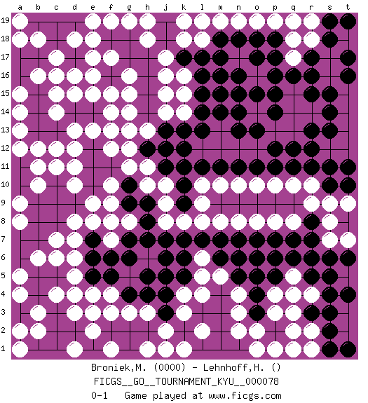 Last move : 0-1 2009 June 10 8:42:28 [Event "FICGS__GO__TOURNAMENT_KYU__000078"] [Site "FICGS"] [Date "2009.03.22"] [Round "1"] [Black "Broniek,Mariusz Maciej"] [White "Lehnhoff,Heinz-Georg"] [Result "0-1"] [Rating 1 "0000"] 1.q16 d4 2.q4 d16 3.k10 r10 4.r11 r9 5.r8 q10 6.q11 p10 7.p11 o10 8.o11 n10 9.n11 m10 10.m11 l10 11.l11 l9 12.k11 d10 13.s11 s8 14.r7 s7 15.s6 s9 16.r6 q8 17.q7 p8 18.p7 o8 19.o7 n8 20.n7 m8 21.m7 l8 22.l7 k8 23.k7 j8 24.h8 j9 25.h9 j10 26.j11 h10 27.g10 h11 28.h12 g11 29.f11 g12 30.j12 f10 31.g9 f9 32.f8 f12 33.e11 d12 34.e10 e9 35.d9 e8 36.e7 d8 37.c9 d11 38.j7 f7 39.g7 g8 40.h7 f8 41.f6 d7 42.e6 d6 43.e5 f4 44.g6 e4 45.f5 k4 46.t6 t7 47.s10 t9 48.t10 k16 49.l16 k14 50.k13 j14 51.h14 g14 52.g13 f13 53.j13 h13 54.h15 g13 55.l14 k15 56.k17 j17 57.j18 k18 58.l17 h18 59.j19 k19 60.h19 g19 61.l19 j16 62.h16 g16 63.g17 f17 64.f16 g15 65.f18 e17 66.g18 h19 67.h17 e18 68.d19 f19 69.l15 j15 70.l13 l18 71.m18 m19 72.m17 n19 73.n18 o19 74.o18 p19 75.p18 q18 76.p17 q17 77.r17 r18 78.s18 s17 79.r16 t18 80.s19 t19 81.t17 s16 82.s15 q19 83.t16 l19 84.c10 c11 85.c8 c7 86.b7 b6 87.b8 b10 88.b9 b11 89.b5 d5 90.a6 c6 91.c5 c4 92.b4 b3 93.c3 b2 94.c2 a4 95.a3 a5 96.a7 a9 97.g4 g3 98.h4 h3 99.j3 j2 100.j4 j5 101.k5 l5 102.k6 l6 103.h5 k3 104.j6 l4 105.b1 a2 106.c1 d3 107.d2 e2 108.e1 f1 109.e12 e13 110.k2 l2 111.h2 j1 112.f2 d1 113.g2 f3 114.e1 e3 115.g1 k1 116.m6 m5 117.n5 n4 118.o4 o5 119.n6 p4 120.o3 p3 121.p5 q3 122.o6 n3 123.r3 r4 124.q2 q5 125.p2 q4 126.s4 o2 127.o5 r2 128.s3 q1 129.s2 p1 130.r5 q2 131.s1 h1 132.q6 r14 133.r13 q14 134.s14 q13 135.s13 q12 136.p12 p13 137.o13 o14 138.n13 n14 139.m14 n15 140.n16 o16 141.p15 f1 142.r12 q15 143.p14 f15 144.r15 e16 145.p16 c19 146.c18 d18 147.b19 c17 148.b17 e19 149.c19 b16 150.b15 c16 151.a16 a14 152.b14 a13 153.b13 a12 154.o17 b12 155.m15 a15 156.a17 a18 157.k9 r19 158.o15 r1 159.p6 o1 160.c13 d13 161.d14 c15 162.e14 c14 163.k12 b18 164.t19 a8 165.t11 a19 166.s5 c12 167.q12 f14 168.j5 d15 169.n15 e15 170.t4 d1 171.t1 n2 172.e1 a1 173.m16 d1 174.n14 pass 0-1 Here are the names of the openings (joseki) played in the four corners : Corner q4 : q4 r9 Hoshi (Hwajeom, Seongjeom, Xingwei`) 4-4 Point. The star or hoshi (4-4) point, emphasizing influence at the potential expense of territory. Corner d16 : d16 j11 Hoshi (Hwajeom, Seongjeom, Xingwei`) 4-4 Point. The star or hoshi (4-4) point, emphasizing influence at the potential expense of territory. Player White won this Go (weiqi, baduk) game. Follow this game move after move (download)Atari, atari is vulgar play. (Anonymous) Wikichess, chess moves explained by 'experimented' players. (Thibault de Vassal)