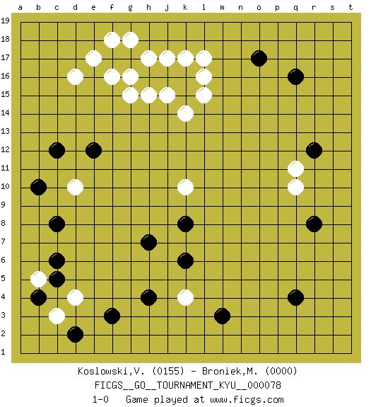 Last move : 1-0 2009 June 27 20:58:15 [Event "FICGS__GO__TOURNAMENT_KYU__000078"] [Site "FICGS"] [Date "2009.03.22"] [Round "1"] [Black "Koslowski,Volker"] [White "Broniek,Mariusz Maciej"] [Result "1-0"] [Rating 1 "0155"] [Rating 2 "0000"] 1.q16 d16 2.q4 d4 3.f17 k10 4.k15 e17 5.k8 d10 6.h16 f16 7.g17 g15 8.c12 f18 9.b10 g16 10.e12 h15 11.j16 j15 12.k16 g18 13.k6 h17 14.o17 q10 15.r8 k4 16.m3 j17 17.c8 k14 18.c6 l15 19.h7 l17 20.h4 l16 21.f3 k17 22.d2 c3 23.r12 q11 24.b4 b5 25.c5 1-0 This go game has been lost on time (started : 2009.03.22 17:6:4) Here are the names of the openings (joseki) played in the four corners : Corner d16 : d16 f17 Hoshi (Hwajeom, Seongjeom, Xingwei`) 4-4 Point. The star or hoshi (4-4) point, emphasizing influence at the potential expense of territory. Ikken Kakari (Hankan Keolch'im, Yi Gua`jiao~, 1-Space Low Approach). Black 2 is the standard approach move to the 4-4. Corner d4 : d4 c8 Hoshi (Hwajeom, Seongjeom, Xingwei`) 4-4 Point. The star or hoshi (4-4) point, emphasizing influence at the potential expense of territory. Player Black won this Go (weiqi, baduk) game. Follow this game move after move (download)Add one stone, then sacrifice both. (Anonymous) When the going gets tactical, the computers get going. (Hyatt)