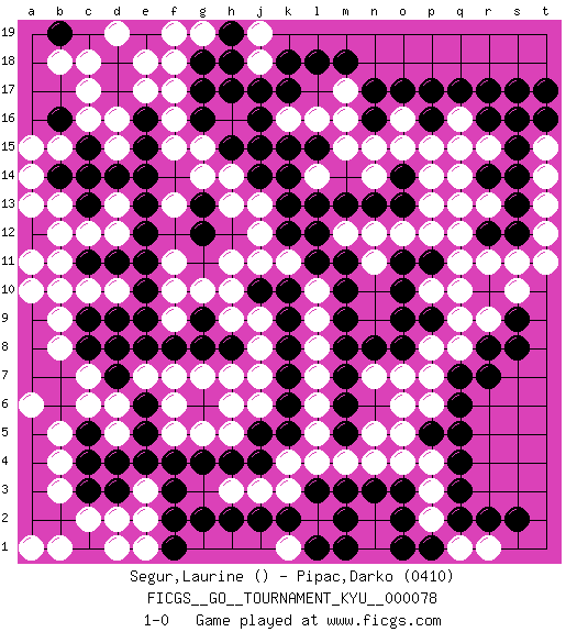 Last move : 1-0 2009 April 17 14:46:29 [Event "FICGS__GO__TOURNAMENT_KYU__000078"] [Site "FICGS"] [Date "2009.03.22"] [Round "1"] [Black "Segur,Laurine"] [White "Pipac,Darko"] [Result "1-0"] [Rating 2 "0410"] 1.c4 q16 2.q4 d16 3.c14 d6 4.e5 f6 5.e6 e7 6.d7 c7 7.d8 c6 8.d4 f7 9.c8 d5 10.e4 b8 11.b10 b9 12.c9 c10 13.c11 d10 14.e9 b11 15.b12 a10 16.a12 c12 17.d11 b13 18.c13 d12 19.e11 a13 20.e10 a11 21.d9 b10 22.e13 f5 23.e12 d13 24.d14 b12 25.b14 a14 26.a5 b5 27.a4 b4 28.a3 b3 29.b2 a6 30.a2 c2 31.c1 d1 32.f4 b1 33.g4 g5 34.h4 h5 35.j4 k4 36.j5 h6 37.k7 j6 38.k5 l4 39.k6 j7 40.k8 j8 41.j10 j9 42.k9 h9 43.g8 f9 44.g9 g10 45.f8 g7 46.h8 f10 47.e8 h10 48.g12 j11 49.k10 h11 50.k12 j12 51.j14 j13 52.k13 h13 53.g13 h14 54.h15 g15 55.j15 g14 56.g16 f15 57.e15 f16 58.e16 e17 59.g17 f17 60.d17 d15 61.e14 b15 62.c15 c16 63.b16 c17 64.d18 c18 65.r17 e18 66.q15 a15 67.p16 k11 68.l11 f11 69.f2 f13 70.o3 l5 71.m5 l6 72.m7 q10 73.r12 r9 74.r7 q8 75.q7 p7 76.p9 p8 77.o9 o6 78.p5 o5 79.m6 n4 80.n3 m4 81.m3 n5 82.n8 l7 83.m9 r11 84.p11 p6 85.r8 q9 86.s12 s11 87.s9 s10 88.s8 q11 89.q13 p10 90.o10 p12 91.o11 q12 92.o14 p13 93.n13 q14 94.r14 r13 95.s13 r15 96.q13 p15 97.s15 p14 98.q17 o16 99.p17 o15 100.o17 n14 101.o13 s16 102.r16 q15 103.l15 o12 104.m13 m15 105.n16 n15 106.n17 m16 107.k17 m17 108.k18 t15 109.s14 t11 110.s17 t12 111.t17 t13 112.t16 t14 113.g18 d19 114.m18 r13 115.s16 q13 116.q6 n7 117.o8 o7 118.k2 l16 119.k15 l8 120.m8 n12 121.l13 p4 122.q5 o4 123.q3 l9 124.m10 l2 125.l3 k3 126.j2 p3 127.l1 p2 128.q2 l10 129.m11 q1 130.r2 n2 131.m2 n1 132.o2 m12 133.l12 k16 134.j17 f19 135.m1 g19 136.h19 j18 137.h18 h16 138.j16 j19 139.l18 f18 140.h17 j3 141.h2 h3 142.g2 k1 143.o1 l14 144.k14 r1 145.s2 e2 146.f3 e3 147.d3 d2 148.c3 e1 149.f1 a1 150.c5 h7 151.b19 b18 152.p1 n11 153.pass pass 154.pass pass 155.pass 1-0 Here are the names of the openings (joseki) played in the four corners : Corner d16 : d16 c14 Hoshi (Hwajeom, Seongjeom, Xingwei`) 4-4 Point. The star or hoshi (4-4) point, emphasizing influence at the potential expense of territory. Ikken Kakari (Hankan Keolch'im, Yi Gua`jiao~, 1-Space Low Approach). Black 2 is the standard approach move to the 4-4. Corner d4 : c4 d6 Komoku (Somok, Xiao~mu`) 3-4 Point. The komoku (3-4) point is the traditional corner enclosure move.. Corner q4 : q4 l4 Hoshi (Hwajeom, Seongjeom, Xingwei`) 4-4 Point. The star or hoshi (4-4) point, emphasizing influence at the potential expense of territory. Corner q16 : q16 r17 Hoshi (Hwajeom, Seongjeom, Xingwei`) 4-4 Point. The star or hoshi (4-4) point, emphasizing influence at the potential expense of territory. Player Black won this Go (weiqi, baduk) game. Follow this game move after move (download)Learn the eye-stealing tesuji. (Anonymous) Men should grow up. - Yeah. And dogs should stop licking themselves. It's not gonna happen. (Gregory House to Dr. Cameron, House M.D.)