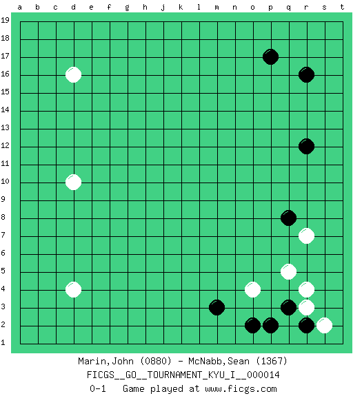 Last move : 0-1 2009 May 11 5:31:15 [Event "FICGS__GO__TOURNAMENT_KYU_I__000014"] [Site "FICGS"] [Date "2009.03.25"] [Round "1"] [Black "Marin,John"] [White "McNabb,Sean"] [Result "0-1"] [Rating 1 "0880"] [Rating 2 "1367"] 1.r16 d4 2.q3 d16 3.p17 q5 4.q8 r3 5.r2 r4 6.p2 s2 7.m3 o4 8.r12 d10 9.o2 r7 0-1 This go game has been lost on time (started : 2009.03.25 17:29:13) Here are the names of the openings (joseki) played in the four corners : Corner q4 : q3 q5 Komoku (Somok, Xiao~mu`) 3-4 Point. The komoku (3-4) point is the traditional corner enclosure move.. Ikken Takagakari (Hankan Nop'dakeolch'im, Yi Gaogua`jiao~, 1-Space High Approach). The 5-4 approach move has become more popular in modern times, as modern Go emphasizes speed and influence. Player White won this Go (weiqi, baduk) game. Follow this game move after move (download)Don't get surrounded ! Ever ! (Anonymous) Thibault, I ask for draw. Game 13876. - Sorry Ilmars, you won. (FICGS chat)