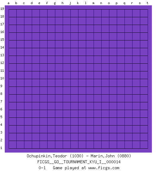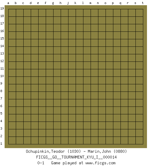 Last move : 0-1 2009 April 25 4:4:50 [Event "FICGS__GO__TOURNAMENT_KYU_I__000014"] [Site "FICGS"] [Date "2009.03.25"] [Round "1"] [Black "Ochupinkin,Teodor"] [White "Marin,John"] [Result "0-1"] [Rating 1 "1030"] [Rating 2 "0880"] 0-1 This go game has been lost on time (started : 2009.03.25 17:29:13) Here are the names of the openings (joseki) played in the four corners : Player White won this Go (weiqi, baduk) game. Follow this game move after move (download)If White takes all four corners, Black should resign; if Black takes all four corners, Black should also resign. (David Kent) You know what they say : You lie down with the Devil, you wake up in Hell. (Horatio Caine, C.S.I. Miami)