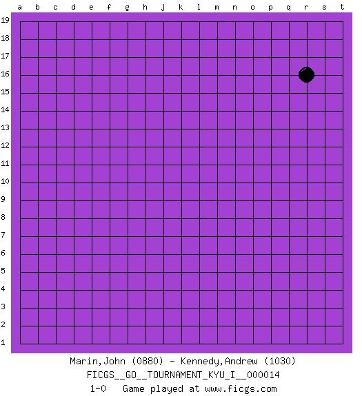 Last move : 1-0 2009 April 25 4:4:50 [Event "FICGS__GO__TOURNAMENT_KYU_I__000014"] [Site "FICGS"] [Date "2009.03.25"] [Round "1"] [Black "Marin,John"] [White "Kennedy,Andrew"] [Result "1-0"] [Rating 1 "0880"] [Rating 2 "1030"] 1.r16 1-0 This go game has been lost on time (started : 2009.03.25 17:29:13) Here are the names of the openings (joseki) played in the four corners : Player Black won this Go (weiqi, baduk) game. Follow this game move after move (download)The nature of a game comes from what is played, but it's the sensitivity to the possible and the impossible that gives it value. (Pierre Audouard) Employ the attack like tactic of defense. (Chinese proverb)