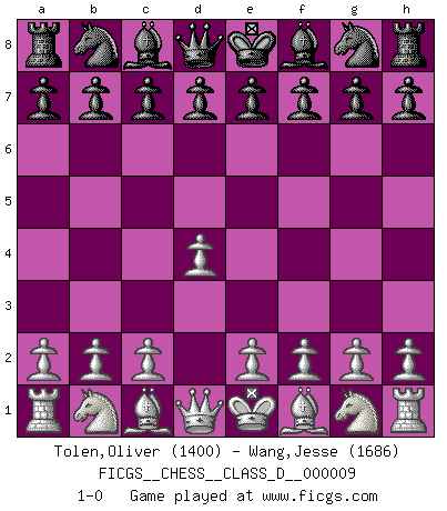 Last move : 1-0 2006 October 15 18:22:8 [Event "FICGS__CHESS__CLASS_D__000009"] [Site "FICGS"] [Date "2006.09.05"] [Round "1"] [White "Tolen,Oliver"] [Black "Wang,Jesse"] [Result "1-0"] [WhiteElo "1400"] [BlackElo "1686"] 1.d4 1-0 This chess game has been lost on time (started : 2006.09.05 12:38:23) Queen's pawn Player White won this chess game. Follow this game move after move (download)Chess is a cold bath for the mind. (Sir John Simon) Matt entspricht nicht immer den Tatsachen. (Savielly Grigorievitsch Tartakower) No nos podemos resistir a la fascinación de un sacrificio ya que la pasión por los sacrificios es parte de la naturaleza de un jugador de Ajedrez. (Rudolf Spielman) Dans le domaine de la peinture, de la gravure et de la sculpture, dès la première décennie de notre siècle, les artistes abandonnent la représentation de la partie d'échecs pour se concentrer sur les pièces, sur les échiquiers et sur toutes les variations auxquelles les unes et les autres peuvent donner lieu. On passe en quelque sorte d'un thème social à un thème musical (au sens de la musica médiévale, c'est-à-dire d'une notion qui inclue le rythme, l'harmonie, la construction et la déconstruction, etc.). Graphiquement et picturalement, l'échiquier apparaît comme une structure ouverte, dynamique, d'une richesse infinie, autorisant toutes les combinatoires et débouchant sur des mouvements et des rythmes de nature exponentielle. (Michel Pastoureau) It's not the will to win, but the will to prepare to win that makes the difference. (Bear Bryant)
