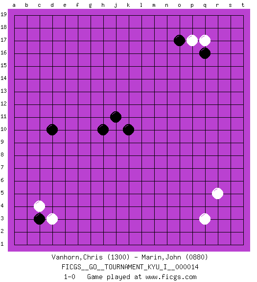 Last move : 1-0 2009 May 11 17:34:34 [Event "FICGS__GO__TOURNAMENT_KYU_I__000014"] [Site "FICGS"] [Date "2009.03.25"] [Round "1"] [Black "Vanhorn,Chris"] [White "Marin,John"] [Result "1-0"] [Rating 1 "1300"] [Rating 2 "0880"] 1.k10 c4 2.c3 q3 3.d10 q17 4.q16 r5 5.j11 d3 6.h10 p17 7.o17 1-0 This go game has been lost on time (started : 2009.03.25 17:29:13) Here are the names of the openings (joseki) played in the four corners : Corner d4 : c4 c3 Komoku (Somok, Xiao~mu`) 3-4 Point. The komoku (3-4) point is the traditional corner enclosure move.. This is not joseki. n invasion to take the corner after White made a shimari-less moyo on top disabling the other moves. Corner q16 : q17 q16 Komoku (Somok, Xiao~mu`) 3-4 Point. The komoku (3-4) point is the traditional corner enclosure move.. Player Black won this Go (weiqi, baduk) game. Follow this game move after move (download)Learning josekis by heart is useless if you don't try departing from them. (Pierre Audouard) If you are going through hell, keep going. (Winston Churchill)