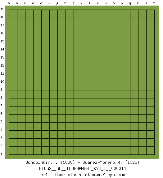 Last move : 0-1 2009 April 25 4:4:50 [Event "FICGS__GO__TOURNAMENT_KYU_I__000014"] [Site "FICGS"] [Date "2009.03.25"] [Round "1"] [Black "Ochupinkin,Teodor"] [White "Suarez-Moreno,Alejandro"] [Result "0-1"] [Rating 1 "1030"] [Rating 2 "1025"] 0-1 This go game has been lost on time (started : 2009.03.25 17:29:13) Here are the names of the openings (joseki) played in the four corners : Player White won this Go (weiqi, baduk) game. Follow this game move after move (download)Go is essentially a form of harmony. Go in the 21st century will have to be go of the 'harmony of the six points - the four quarters, the above and the below.' As in life we will need to view the whole rather than the part. Japanese go has focused too heavily on the local (joseki) rather than the whole for 300 years. The reason the Chinese and Koreans are overtaking the Japanese is that they are closer to achieve this whole-board view. (Go Seigen, 9p, 1994) It is not true that people stop pursuing dreams because they grow old, they grow old because they stop pursuing dreams. (Gabriel Garcia Marquez)