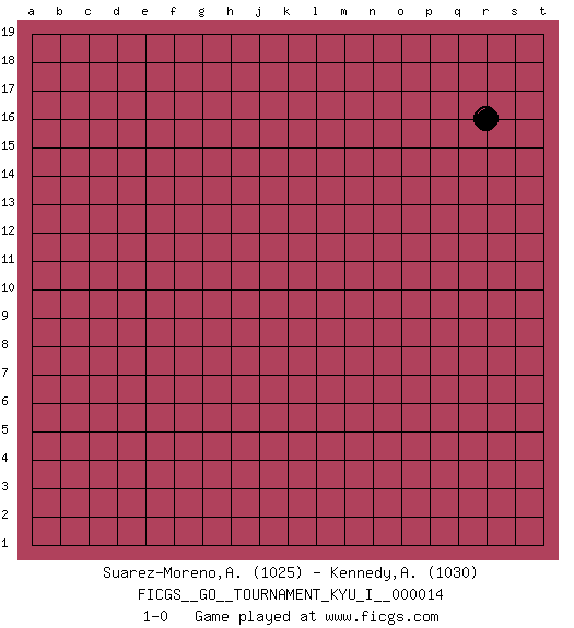Last move : 1-0 2009 April 25 16:5:50 [Event "FICGS__GO__TOURNAMENT_KYU_I__000014"] [Site "FICGS"] [Date "2009.03.25"] [Round "1"] [Black "Suarez-Moreno,Alejandro"] [White "Kennedy,Andrew"] [Result "1-0"] [Rating 1 "1025"] [Rating 2 "1030"] 1.r16 1-0 This go game has been lost on time (started : 2009.03.25 17:29:13) Here are the names of the openings (joseki) played in the four corners : Player Black won this Go (weiqi, baduk) game. Follow this game move after move (download)Pon-nuki is worth thirty points. (Anonymous) The hypothalamus is one of the most important parts of the brain, involved in many kinds of motivation, among other functions. The hypothalamus controls the 'Four Fs: Fighting, Fleeing, Feeding and Mating. (Unknown author)
