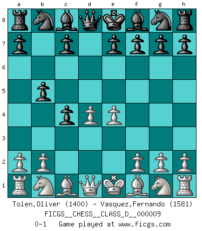 Last move : 0-1 2006 October 17 18:27:0 [Event "FICGS__CHESS__CLASS_D__000009"] [Site "FICGS"] [Date "2006.09.05"] [Round "1"] [White "Tolen,Oliver"] [Black "Vasquez,Fernando"] [Result "0-1"] [WhiteElo "1400"] [BlackElo "1581"] 1.d4 d5 2.c4 dxc4 3.e4 b5 0-1 This chess game has been lost on time (started : 2006.09.05 12:38:23) QGA : 3.e4 Player Black won this chess game. Follow this game move after move (download)Chess is everything: art, science and sport. (Anatoly Karpov) Ein Springer auf f6 gegen die eigene Rochadestellung ist schlimmer als ein rostiger Nagel im Knie. (Efim Bogoljubov) El Ajedrez es una guerra en un tablero. El objetivo es aplastar la mente del oponente. (Bobby Fischer) Nous sommes les pions de la mystérieuse partie d'Echecs jouée par Dieu. Il nous déplace, nous arrête, nous pousse encore, puis nous lance un à un dans la boîte du Néant. Epitaphe sur la tombe de David Janowsky (1868-1927). But they are useless. They can only give you answers. (Pablo Picasso, about computers)