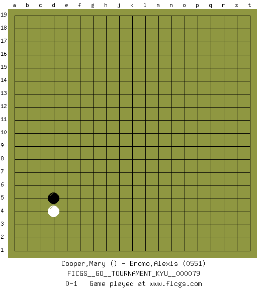 Last move : 0-1 2009 April 28 16:20:0 [Event "FICGS__GO__TOURNAMENT_KYU__000079"] [Site "FICGS"] [Date "2009.03.28"] [Round "1"] [Black "Cooper,Mary"] [White "Bromo,Alexis"] [Result "0-1"] [Rating 2 "0551"] 1.d5 d4 0-1 This go game has been lost on time (started : 2009.03.28 1:41:39) Here are the names of the openings (joseki) played in the four corners : Corner d4 : d5 d4 Takamoku (Gomok, Gaomu`) 5-4 Point. The takamoku (high) point (5-4). With its emphasis on influence, the 5-4 point complements the 4-4 (hoshi) point in creating an influence-oriented fuseki. Player White won this Go (weiqi, baduk) game. Follow this game move after move (download)If there is no stone on the handicap point, the carpenter's square is dead. (Anonymous) If you don't practice you don't deserve to win. (Andre Agassi)