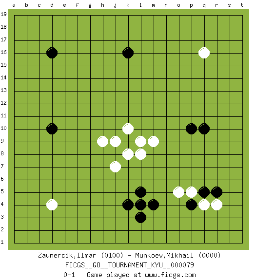 Last move : 0-1 2009 April 8 19:28:41 [Event "FICGS__GO__TOURNAMENT_KYU__000079"] [Site "FICGS"] [Date "2009.03.28"] [Round "1"] [Black "Zaunercik,Ilmar"] [White "Munkoev,Mikhail"] [Result "0-1"] [Rating 1 "0100"] [Rating 2 "0000"] 1.k4 d4 2.l4 k10 3.k9 q4 4.m4 m9 5.l5 h9 6.l3 l8 7.q10 q16 8.d10 j7 9.d16 k8 10.p4 j9 11.k16 l9 12.q5 r4 13.r5 p5 14.p10 o5 0-1 Here are the names of the openings (joseki) played in the four corners : Corner q4 : l4 q4 This joseki is unknown. A weak or weird move has probably been played in this corner. Player White won this Go (weiqi, baduk) game. Follow this game move after move (download)Don't make a play adjacent to a cutting-point. (Anonymous) Creativity is inventing, experimenting, growing, taking risks, breaking rules, making mistakes, and having fun. (Mary Lou Cook)