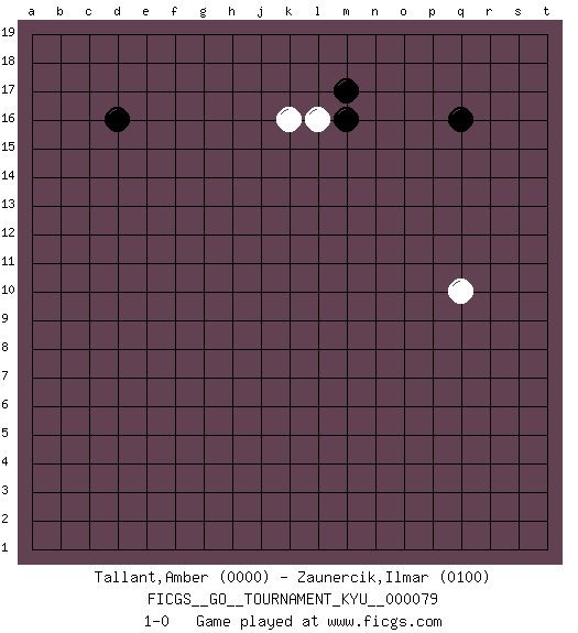 Last move : 1-0 2009 April 8 19:28:33 [Event "FICGS__GO__TOURNAMENT_KYU__000079"] [Site "FICGS"] [Date "2009.03.28"] [Round "1"] [Black "Tallant,Amber"] [White "Zaunercik,Ilmar"] [Result "1-0"] [Rating 1 "0000"] [Rating 2 "0100"] 1.q16 k16 2.d16 l16 3.m16 q10 4.m17 1-0 Here are the names of the openings (joseki) played in the four corners : Corner q16 : q16 l16 Hoshi (Hwajeom, Seongjeom, Xingwei`) 4-4 Point. The star or hoshi (4-4) point, emphasizing influence at the potential expense of territory. Player Black won this Go (weiqi, baduk) game. Follow this game move after move (download)Conservative and slow will win. Believe it ! (Anonymous) I fear not the man who has practiced 10,000 kicks once, but I fear the man who has practiced one kick 10,000 times. (Bruce Lee)