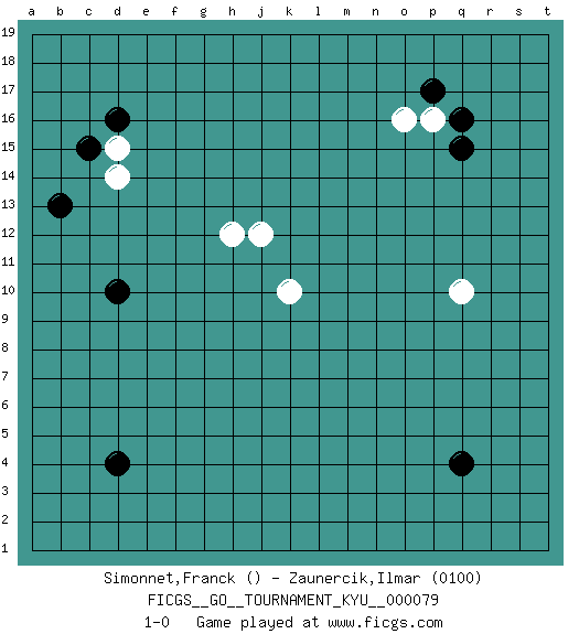 Last move : 1-0 2009 April 8 19:28:21 [Event "FICGS__GO__TOURNAMENT_KYU__000079"] [Site "FICGS"] [Date "2009.03.28"] [Round "1"] [Black "Simonnet,Franck"] [White "Zaunercik,Ilmar"] [Result "1-0"] [Rating 2 "0100"] 1.d4 j12 2.d16 h12 3.q4 d15 4.c15 d14 5.q16 p16 6.p17 o16 7.d10 q10 8.q15 k10 9.b13 1-0 Here are the names of the openings (joseki) played in the four corners : Corner d16 : j12 d16 This joseki is unknown. A weak or weird move has probably been played in this corner. Corner q16 : q16 p16 Hoshi (Hwajeom, Seongjeom, Xingwei`) 4-4 Point. The star or hoshi (4-4) point, emphasizing influence at the potential expense of territory. Corner d4 : d4 1-0 Hoshi (Hwajeom, Seongjeom, Xingwei`) 4-4 Point. The star or hoshi (4-4) point, emphasizing influence at the potential expense of territory. Player Black won this Go (weiqi, baduk) game. Follow this game move after move (download)You have to like to win, and to learn to recognize the errors that gave you the victory. (Pierre Audouard) If things go wrong, don't go with them. (Roger Babson)