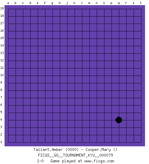Last move : 1-0 2009 April 30 4:33:28 [Event "FICGS__GO__TOURNAMENT_KYU__000079"] [Site "FICGS"] [Date "2009.03.28"] [Round "1"] [Black "Tallant,Amber"] [White "Cooper,Mary"] [Result "1-0"] [Rating 1 "0000"] 1.q4 1-0 This go game has been lost on time (started : 2009.03.28 1:41:39) Here are the names of the openings (joseki) played in the four corners : Corner q4 : q4 1-0 Hoshi (Hwajeom, Seongjeom, Xingwei`) 4-4 Point. The star or hoshi (4-4) point, emphasizing influence at the potential expense of territory. Player Black won this Go (weiqi, baduk) game. Follow this game move after move (download)The weak player fears ko, the strong player seeks it. (Bill Taylor) The beginning is the most important part of the work. (Plato)