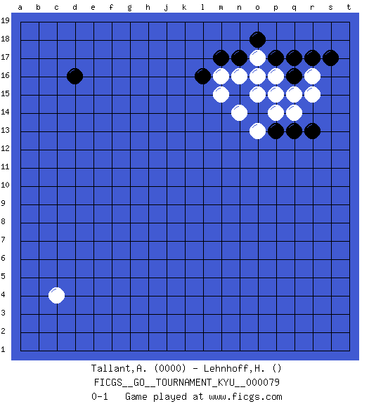 Last move : 0-1 2009 May 17 6:10:26 [Event "FICGS__GO__TOURNAMENT_KYU__000079"] [Site "FICGS"] [Date "2009.03.28"] [Round "1"] [Black "Tallant,Amber"] [White "Lehnhoff,Heinz-Georg"] [Result "0-1"] [Rating 1 "0000"] 1.d16 r16 2.q17 c4 3.q16 r15 4.r17 q15 5.p15 p14 6.o14 o13 7.p13 q14 8.s17 o15 9.o16 n14 10.q13 p16 11.p17 p15 12.r13 o17 13.n17 n16 14.m17 m16 15.o18 o16 16.l16 m15 0-1 This go game has been lost on time (started : 2009.03.28 1:41:39) Here are the names of the openings (joseki) played in the four corners : Corner q16 : r16 q17 Komoku (Somok, Xiao~mu`) 3-4 Point. The komoku (3-4) point is the traditional corner enclosure move.. Player White won this Go (weiqi, baduk) game. Follow this game move after move (download)Studying go is a wonderful way to develop both the creative as well as the logical abilities of children because to play it both sides of the brain are necessary. (Cho Chikun) Computers have lots of memory but no imagination. (Anonymous)