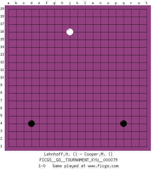 Last move : 1-0 2009 April 28 4:19:43 [Event "FICGS__GO__TOURNAMENT_KYU__000079"] [Site "FICGS"] [Date "2009.03.28"] [Round "1"] [Black "Lehnhoff,Heinz-Georg"] [White "Cooper,Mary"] [Result "1-0"] 1.d4 j16 2.q4 1-0 This go game has been lost on time (started : 2009.03.28 1:41:39) Here are the names of the openings (joseki) played in the four corners : Corner q4 : q4 1-0 Hoshi (Hwajeom, Seongjeom, Xingwei`) 4-4 Point. The star or hoshi (4-4) point, emphasizing influence at the potential expense of territory. Player Black won this Go (weiqi, baduk) game. Follow this game move after move (download)Five groups might live but the six will die. (Anonymous) Life is like a play: it's not the length but the excellence of the acting that matters. (Seneca)