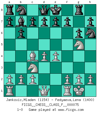 Last move : 1-0 2009 June 8 18:37:32 [Event "FICGS__CHESS__CLASS_F__000075"] [Site "FICGS"] [Date "2009.03.29"] [Round "1"] [White "Jankovic,Mladen"] [Black "Fedyaeva,Lena"] [Result "1-0"] [WhiteElo "1154"] [BlackElo "1400"] 1.e4 b6 2.d4 g6 3.Nf3 Bh6 4.Bxh6 Nxh6 5.Bc4 Rf8 6.Nc3 Bb7 7.O-O Rg8 8.Ng5 1-0 This chess game has been lost on time (started : 2009.03.29 17:4:46) Owen defense Kingside Castling by player White (move 7) Player White won this chess game. Follow this game move after move (download)Excellence at Chess is one mark of a scheming mind. (Sir Arthur Conan Doyle) Ihnen, Herr Lasker, habe ich nur drei Worte zu sagen: Schach und matt. (Siegbert Tarrasch) Si un gobernante no entiende al Ajedrez, ¿como puede governar él un reinado?. (El Rey Khusros II) Tous ces prétendus hommes politiques sont les pions, les Cavaliers, les Tours ou les Fous d'une partie d'échecs qui se jouera tant qu'un hasard ne renversera pas l'échiquier. (Honoré de Balzac) Never was anything great achieved without danger. (Niccolo Machiavelli)