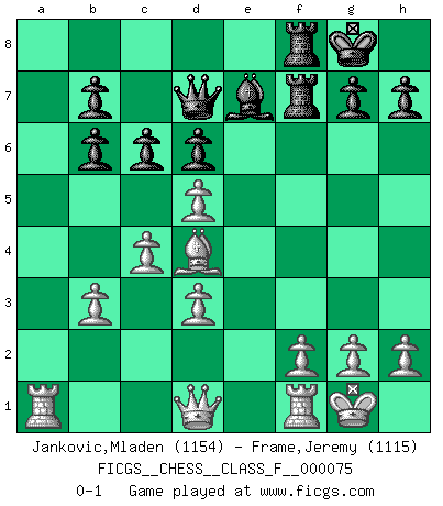 Last move : 0-1 2009 July 8 22:7:11 [Event "FICGS__CHESS__CLASS_F__000075"] [Site "FICGS"] [Date "2009.03.29"] [Round "1"] [White "Jankovic,Mladen"] [Black "Frame,Jeremy"] [Result "0-1"] [WhiteElo "1154"] [BlackElo "1115"] 1.e4 e5 2.Nf3 Nf6 3.Nxe5 d6 4.Nxf7 Kxf7 5.Bc4+ Be6 6.Bxe6+ Kxe6 7.d3 Be7 8.O-O Nbd7 9.Nc3 Nb6 10.b3 Kf7 11.a4 Qd7 12.a5 Rhf8 13.axb6 axb6 14.Bb2 Kg8 15.Nd5 Nxd5 16.exd5 Rf7 17.c4 Raf8 18.Bd4 c6 0-1 This chess game has been lost on time (started : 2009.03.29 17:4:46) Petrov : Cochrane gambit Kingside Castling by player White (move 8) Player Black won this chess game. Follow this game move after move (download)The King is a fighting piece. Use it ! (Wilhelm Steinitz) Die unerbitterlichsten Regeln im Schach sind die Ausnahmen. (Savielly Grigorievitsch Tartakower) Cada Peón es potencialmente una Reina. (James Mason) Tout change constamment, y compris dans le monde des Echecs. (Botvinnik) Perhaps chess is the wrong game for the times (The Chess Master and the Computer, by Garry Kasparov - 2010)