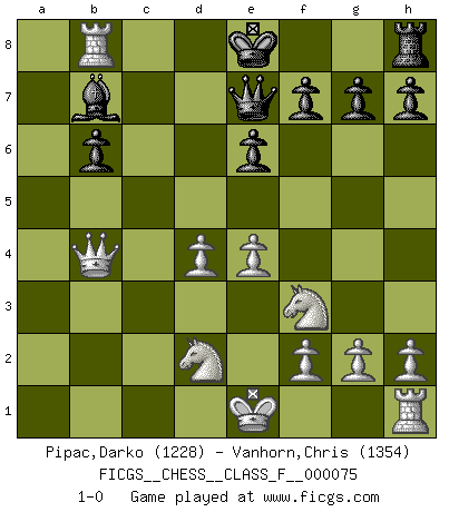 Last move : 1-0 2009 April 6 19:50:49 [Event "FICGS__CHESS__CLASS_F__000075"] [Site "FICGS"] [Date "2009.03.29"] [Round "1"] [White "Pipac,Darko"] [Black "Vanhorn,Chris"] [Result "1-0"] [WhiteElo "1228"] [BlackElo "1354"] 1.e4 e6 2.d4 Bb4+ 3.Bd2 a5 4.Nf3 b6 5.a3 Bxd2+ 6.Nbxd2 Ba6 7.c4 c6 8.b4 d5 9.b5 cxb5 10.cxd5 b4 11.axb4 axb4 12.Qb3 Bxf1 13.Rxa8 Ba6 14.Qxb4 Ne7 15.d6 Bb7 16.dxe7 Qxe7 17.Rxb8+ 1-0 French defense Player White won this chess game. Follow this game move after move (download)Whoever sees no other aim in the game than that of giving checkmate to one's opponent will never become a good Chess player. (Euwe) Darum geht es im Schach. Einen Tag gibst du deinem Gegner eine Lektion, am nächsten Tag gibt er dir eine. (Robert James Fischer) Fischer deseaba darle a los Rusos una sopa de su propia medicina. (Larry Evans) Le moment que je préfère le plus dans une rencontre, c'est celui où je sens que la personnalité de l'adversaire se brise. (Robert Fischer) A government big enough to give you everything you want is strong enough to take everything you have. (Thomas Jefferson)