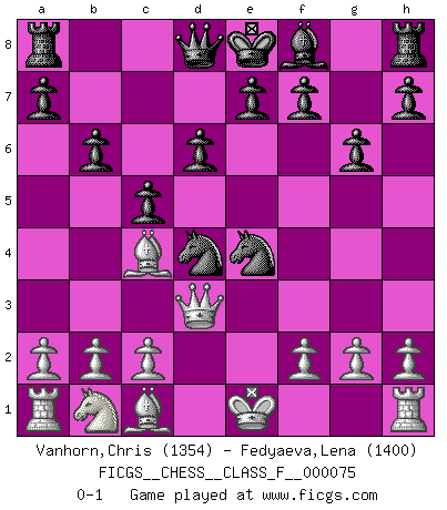 Last move : 0-1 2009 June 26 8:48:48 [Event "FICGS__CHESS__CLASS_F__000075"] [Site "FICGS"] [Date "2009.03.29"] [Round "1"] [White "Vanhorn,Chris"] [Black "Fedyaeva,Lena"] [Result "0-1"] [WhiteElo "1354"] [BlackElo "1400"] 1.e3 b6 2.Qf3 Bb7 3.e4 g6 4.Bc4 Nf6 5.d3 Nc6 6.Nh3 d6 7.d4 Nxd4 8.Qd3 c5 9.Ng5 Bxe4 10.Nxe4 Nxe4 0-1 Van't Kruijs Opening Player Black won this chess game. Follow this game move after move (download)It is no time to be playing Chess when the house is on fire. (Italian Proverb) Alle Schachspieler sollten auch ein Hobby haben. (Savielly Grigorievitsch Tartakower) Las combinaciones han sido siempre el aspecto más intrigante del Ajedrez. Los Maestros las buscan, el público las aplauden, los críticos las alaban. La razón se debe a que las combinaciones hacen posible que el Ajedrez sea más que un ejercicio matemático con una carencia de vida. Ellas son la poesía del juego, son del Ajedrez lo que la melodía es de la música. Ellas representan el triunfo de la mente sobre la materia. (Reuben Fine) Donnez-moi un Cavalier en 6e et je gagnerais toutes mes parties. (Steinitz) The various flowers seem good to different people. (Chinese proverb)
