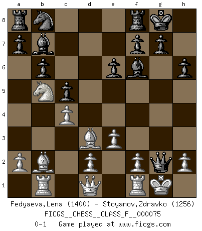 Last move : 0-1 2009 June 5 18:5:28 [Event "FICGS__CHESS__CLASS_F__000075"] [Site "FICGS"] [Date "2009.03.29"] [Round "1"] [White "Fedyaeva,Lena"] [Black "Stoyanov,Zdravko"] [Result "0-1"] [WhiteElo "1400"] [BlackElo "1256"] 1.e3 c5 2.b3 Nf6 3.Bb2 e6 4.Bd3 Be7 5.Nh3 h6 6.c4 b6 7.Na3 d5 8.Nf4 dxc4 9.bxc4 Bb7 10.O-O O-O 11.Nh5 Qd6 12.Nb5 Qc6 13.Nxf6+ Bxf6 14.Rb1 Qxg2+ 0-1 Van't Kruijs Opening Kingside Castling by player White (move 10) Kingside Castling by player Black (move 10) Player Black won this chess game. Follow this game move after move (download)Fischer is the strongest player in the world. In fact, the strongest player who ever lived. (Larry Evans) Im Reiche der Wirklichkeit ist man nie so glücklich wie im Reiche der Gedanken. (Arthur Schopenhauer) Por tratar de evitar la pérdida de una pieza, muchas personas han perdido una partida de Ajedrez. (Savielly Tartakover) La vérité est comme le meilleur coup aux échecs : elle existe, mais il faut la chercher. (Arturo Perez-Reverte) Either move or be moved. (Ezra Pound)