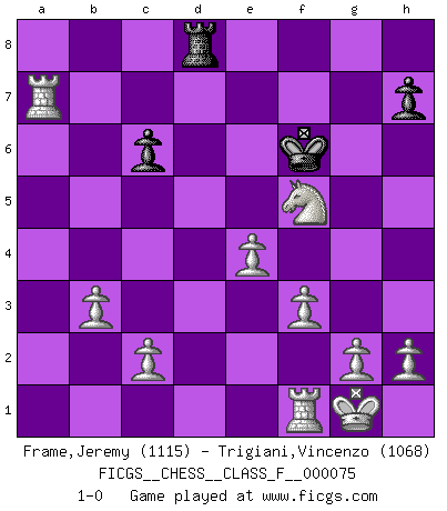 Last move : 1-0 2009 June 7 9:52:28 [Event "FICGS__CHESS__CLASS_F__000075"] [Site "FICGS"] [Date "2009.03.29"] [Round "1"] [White "Frame,Jeremy"] [Black "Trigiani,Vincenzo"] [Result "1-0"] [WhiteElo "1115"] [BlackElo "1068"] 1.e4 e6 2.d4 d6 3.Nf3 Nf6 4.Nc3 e5 5.dxe5 dxe5 6.Bg5 Qxd1+ 7.Rxd1 Nc6 8.Bb5 Be7 9.Bxc6+ bxc6 10.Nxe5 Bg4 11.f3 Be6 12.Nxc6 O-O 13.Nxe7+ Kh8 14.Bxf6 gxf6 15.Ncd5 c6 16.Nxf6 Bxa2 17.b3 Rad8 18.O-O Kg7 19.Nd7 f5 20.Nxf5+ Kf7 21.Nxf8 Rxf8 22.Ra1 Rd8 23.Rxa2 Kf6 24.Rxa7 1-0 Lengfellner system Kingside Castling by player Black (move 12) Kingside Castling by player White (move 18) Player White won this chess game. Follow this game move after move (download)Chess is a terrific way for kids to build self image and self esteem. (Saudin Robovic) Das Schachspiel ist ein See, in welchem eine Mücke baden und ein Elefant ertrinken kann. (Emanuel Lasker) Fischer era un maestro de claridad y un Rey del posicionamiento astuto. Sus oponentes podían ver hacia donde se dirigía pero eran impotentes para detenerlo. (Bruce Pandolfini) Horreur, mais aussi harmonie suprême : qu'y avait-il en effet au monde en dehors des échecs ? Le brouillard, l'inconnu, le non-être... (Vladimir Nabokov) Bobby never cared about money, though. His only desire was to prove that his choices were correct: He wanted chess to be important because he was a chess player, and he wanted to be important. Bobby knew money was important, but he didn't have a clue why, outside of clothes and status. The only way he could accomplish what he wanted was to fight for a lot of money. Once he got it, he gave it away. He did not know how to spend it. And once he'd become champion, after, essentially, sacrificing his life for it, he didn't know how to spend his time. (Bob Wade)