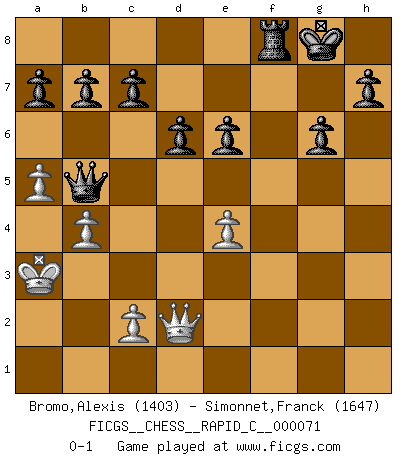 Last move : 0-1 2009 April 16 20:43:27 [Event "FICGS__CHESS__RAPID_C__000071"] [Site "FICGS"] [Date "2009.03.29"] [Round "1"] [White "Bromo,Alexis"] [Black "Simonnet,Franck"] [Result "0-1"] [WhiteElo "1403"] [BlackElo "1647"] 1.e4 e5 2.d4 exd4 3.Qxd4 Nc6 4.Qe3 d6 5.Nc3 Nf6 6.Bd2 g6 7.Bc4 Bg7 8.O-O-O O-O 9.h3 Ne5 10.Bb3 Be6 11.Bxe6 fxe6 12.f4 Nc4 13.Qd3 Nxd2 14.Rxd2 Nh5 15.Nge2 Nxf4 16.Nxf4 Rxf4 17.Rf1 Rxf1+ 18.Qxf1 Bh6 19.Qd1 Bxd2+ 20.Qxd2 Qe7 21.g3 Rf8 22.b4 Qf6 23.a4 Qf1+ 24.Kb2 Qxh3 25.a5 Qxg3 26.Nb5 Qe5+ 27.Ka3 Qxb5 0-1 Centre game : Paulsen attack Queenside Castling by player White (move 8) Kingside Castling by player Black (move 8) Player Black won this chess game. Follow this game move after move (download)Botvinnik tried to take the mystery out of Chess, always relating it to situations in ordinary life. He used to call Chess a typical inexact problem similar to those which people are always having to solve in everyday life. (Garry Kasparov) Besser ein falscher Plan, logisch durchgeführt, als gar kein Plan. (Viktor Kortschnoi) La belleza de un movimiento no se refleja solo en su apariencia, sino en el pensamiento detrás de él. (Siegbert Tarrasch) Une platitude souvent récitée à propos des Echecs est qu'une des choses les plus difficiles à réaliser est de gagner une position gagnante. Cela ne manque pas de sens mais, pour ma part, j'ai toujours trouvé plus difficile de gagner une position perdante. (Tim Krabbe) Fear is the path to the dark side. Fear leads to anger; anger leads to hate; hate leads to suffering. I sense much fear in you. (Master Yoda in Star Wars ep.1)