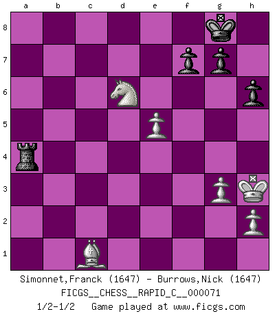 Last move : 1/2-1/2 2009 April 25 14:54:34 [Event "FICGS__CHESS__RAPID_C__000071"] [Site "FICGS"] [Date "2009.03.29"] [Round "1"] [White "Simonnet,Franck"] [Black "Burrows,Nick"] [Result "1/2-1/2"] [WhiteElo "1647"] [BlackElo "1647"] 1.d4 Nf6 2.c4 c5 3.d5 b5 4.cxb5 a6 5.bxa6 e6 6.Nc3 exd5 7.Nxd5 Nxa6 8.e4 Bb7 9.Bc4 Nb4 10.Nxb4 Qa5 11.Nf3 Qxb4+ 12.Nd2 Bd6 13.a3 Qa5 14.O-O Qc7 15.g3 O-O 16.Re1 Rae8 17.Bd3 Be5 18.Nc4 Bd4 19.Bf4 Qc6 20.Na5 Qb6 21.Nxb7 c4 22.Qf3 cxd3 23.Nd6 Re6 24.e5 Ng4 25.Qxg4 Bxf2+ 26.Kg2 Bxe1 27.Rxe1 Qxb2+ 28.Kh3 Qxa3 29.Nf5 Rg6 30.Qf3 h6 31.Rd1 Qa2 32.Ne7+ Kh8 33.Qd5 Ra6 34.Qxa2 Rxa2 35.Rxd3 Rfa8 36.Rxd7 R2a7 37.Rxa7 Rxa7 38.Nf5 Ra4 39.Nd6 Kg8 40.Bc1 Ra1 41.Bb2 Ra2 42.Bc1 Ra1 43.Bf4 Ra4 44.Bc1 1/2-1/2 Benko gambit accepted Kingside Castling by player White (move 14) Kingside Castling by player Black (move 15) This chess game ended in a draw. Follow this game move after move (download)Castle early and often. (Rob Sillars) Je mehr wir mit Computern analysieren, desto mehr glauben wir an Verteidigung. (Vladimir Kramnik) Bobby Fischer es el mas grande genio de Ajedrez de todos los tiempos. (Alexander Kotov) Un journaliste : 'Vous préférez avoir une dame de plus sur l'échiquier ou au lit ?' Boris Spassky : 'Ca dépend de la position.' Question: Is 'This statement is paradoxical' a paradoxical statement ? Or is it a meta-paradox ? (Normajean Yates)