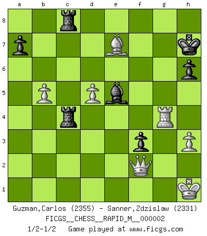 Last move : 1/2-1/2 2006 May 27 13:59:41 [Event "FICGS__CHESS__RAPID_M__000002"] [Site "FICGS"] [Date "2006.04.18"] [Round "1"] [White "Guzman,Carlos"] [Black "Sanner,Zdzislaw"] [Result "1/2-1/2"] [WhiteElo "2355"] [BlackElo "2331"] 1.d4 Nf6 2.c4 g6 3.Nf3 Bg7 4.Nc3 O-O 5.e4 d6 6.g3 Bg4 7.Bg2 Nc6 8.h3 Bxf3 9.Bxf3 e5 10.d5 Nd4 11.Bg2 c5 12.O-O Nd7 13.Be3 f5 14.exf5 gxf5 15.f4 Kh8 16.Qd2 Rg8 17.Kh2 Qe8 18.Rae1 Qg6 19.Rg1 Rae8 20.Nb5 Nxb5 21.cxb5 Nf6 22.Bf3 exf4 23.gxf4 Qh6 24.Rg5 Ne4 25.Bxe4 Rxe4 26.Reg1 Qf6 27.b3 R4e8 28.b4 Qe7 29.R1g3 b6 30.bxc5 bxc5 31.Qg2 Qf7 32.a4 h6 33.Rg6 Kh7 34.Bg1 Re4 35.Rxd6 Rxf4 36.Re6 Rxa4 37.Bxc5 Rc4 38.Bd6 f4 39.Rg4 f3 40.Qf2 Rgc8 41.Re7 Be5 42.Kh1 Qxe7 43.Bxe7 1/2-1/2 King's Indian, 3.Nf3 Kingside Castling by player Black (move 4) Kingside Castling by player White (move 12) This chess game ended in a draw. Follow this game move after move (download)A bad day of Chess is better than any good day at work. (Anonymous) Unter Putin wird alles Geld aus Russland wie von einem Staubsauger nach Moskau umgeleitet, das ist wie ein schwarzes Loch. (Garry Kasparov) Alguna parte de un error es siempre correcto. (Savielly Tartakover) Avec des compensations pour le matériel en plus... (Anonyme) A bird doesn't sing because it has an answer, it sings because it has a song. (Maya Angelou)
