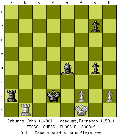 Last move : 0-1 2007 February 9 12:7:42 [Event "FICGS__CHESS__CLASS_D__000009"] [Site "FICGS"] [Date "2006.09.05"] [Round "1"] [White "Caburro,John"] [Black "Vasquez,Fernando"] [Result "0-1"] [WhiteElo "1400"] [BlackElo "1581"] 1.d4 d5 2.c4 dxc4 3.Nf3 Nf6 4.e3 e6 5.Bxc4 c5 6.O-O cxd4 7.exd4 Nc6 8.Nc3 Be7 9.Bg5 O-O 10.Rc1 a6 11.a4 Qa5 12.Re1 Rd8 13.Qd2 h6 14.Bh4 Qb4 15.b3 b5 16.axb5 axb5 17.Nxb5 Nxd4 18.Nbxd4 Qxd2 19.Nxd2 Rxd4 20.Nf3 Rd8 21.Bg3 Bb7 22.Ne5 Nh5 23.Nxf7 Kxf7 24.Bxe6+ Kf6 25.Bc7 Bb4 26.Bxd8+ Rxd8 27.Bg4 Bxe1 28.Rxe1 Nf4 29.g3 h5 30.gxf4 hxg4 31.Rc1 Kf5 32.Kf1 Rd3 33.Rc7 Bf3 34.Rc1 Rxb3 35.Ra1 Kxf4 36.Rc1 Ke4 37.Ra1 Rb2 38.Rc1 Kd3 39.Re1 Ra2 40.Rb1 Kc2 41.Re1 Kd2 42.Rb1 Be4 0-1 QGA : Classical, Steinitz variation Kingside Castling by player White (move 6) Kingside Castling by player Black (move 9) 10 pieces endgame at move 34 : White KRPPP , Black KRBPP WHITE : King + 1 Rook 3 Pawns BLACK : King + 1 Rook 1 Bishop 2 Pawns 9 pieces endgame at move 35 : White KRPP , Black KRBPP WHITE : King + 1 Rook 2 Pawns BLACK : King + 1 Rook 1 Bishop 2 Pawns Player Black won this chess game. Follow this game move after move (download)By playing at Chess then, we may learn: First: Foresight... Second: Circumspection... Third: Caution... And lastly, we learn by Chess the habit of not being discouraged by present bad appearances in the state of our affairs, the habit of hoping for a favorable chance, and that of persevering in the secrets of resources. (Benjamin Franklin) Charakterschwächen offenbaren sich normalerweise während einer Schachpartie. (Garry Kasparov) Me siento como si fuera una pieza en una partida de Ajedrez, cuando mi oponente me indica: esa pieza no puede ser movida. (Soren Kierkegaard) Fischer est le meilleur joueur du monde et Karpov n'est qu'un joueur de bistrot. (Garry Kasparov, agé de 16 ans) Nowadays, anyone who cannot speak English and is incapable of using the Internet is regarded as backward. (Al-Waleed bin Talal)