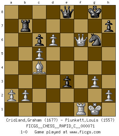 Last move : 1-0 2009 May 24 23:19:28 [Event "FICGS__CHESS__RAPID_C__000071"] [Site "FICGS"] [Date "2009.03.29"] [Round "1"] [White "Cridland,Graham"] [Black "Plunkett,Louis"] [Result "1-0"] [WhiteElo "1677"] [BlackElo "1557"] 1.e4 c5 2.Nf3 e6 3.d4 cxd4 4.Nxd4 Nc6 5.Nc3 Qc7 6.Be3 a6 7.Be2 Nf6 8.O-O Bb4 9.Na4 Be7 10.Nxc6 bxc6 11.Nb6 Rb8 12.Nxc8 Qxc8 13.Bd4 O-O 14.e5 Nd5 15.c4 Nf4 16.Bf3 d5 17.exd6 Bg5 18.g3 Ng6 19.c5 e5 20.Bc3 f5 21.Qa4 e4 22.Be2 Kh8 23.Bxa6 Qe8 24.Qc2 f4 25.Rae1 e3 26.fxe3 fxe3 27.Rxf8+ Qxf8 28.Rf1 Qe8 29.Be2 Ne5 30.Qf5 Bf6 31.Bh5 Ng6 32.Bxf6 gxf6 33.Qxf6+ Kg8 34.Be2 Rb7 35.Bc4+ 1-0 Sicilian : Taimanov variation Kingside Castling by player White (move 8) Kingside Castling by player Black (move 13) Player White won this chess game. Follow this game move after move (download)Could we look into the head of a Chess player, we should see there a whole world of feelings, images, ideas, emotion and passion. (Alfred Binet) Es hat in meinem Leben Zeiten gegeben, in denen das Schachspiel, wenn nicht zum Lebenszweck, so doch zu einem regelrechten Lebensersatz geworden ist. Man fühlt sich in solchen Zeiten nicht so, als besäße man eine göttliche Gabe, sondern eher so, als sei man von ihr besessen. (Garry Kasparov) Las piezas de Ajedrez son los bloques del alfabeto que moldean los pensamientos; y esos pensamientos, aunque hagan un diseño visual en el tablero, expresan abstractamente su belleza como un poema. (Marcel Duchamp) Botvinnik disait en comparant les échecs à la musique: Il existe une science dont le but est l'étude de l'acoustique et des sons. Mais il y a aussi un art qui se sert de l'océan des sons : c'est la musique. De toute évidence, il en est de même pour la pensée. La logique est l'étude des lois de la réflexion et les échecs reflètent, en tant qu'art, le côté logique de la réflexion, sous la forme d'images artistiques... Extrait de Fischer - Spassky, Reykjavik 1972 par Alexander & F. Wyndham (Ed. Solar), p 37. It's not a bug - it's an undocumented feature. (Anonymous)