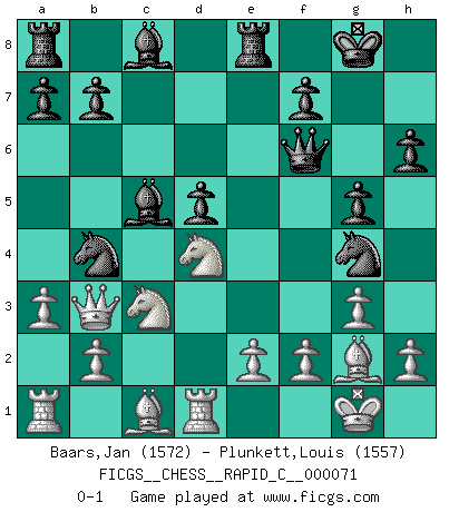 Last move : 0-1 2009 May 4 8:58:12 [Event "FICGS__CHESS__RAPID_C__000071"] [Site "FICGS"] [Date "2009.03.29"] [Round "1"] [White "Baars,Jan"] [Black "Plunkett,Louis"] [Result "0-1"] [WhiteElo "1572"] [BlackElo "1557"] 1.d4 d5 2.c4 e6 3.Nc3 c5 4.cxd5 exd5 5.Nf3 Nc6 6.g3 Nf6 7.Bg2 Be7 8.O-O O-O 9.Bg5 cxd4 10.Nxd4 h6 11.Be3 Re8 12.Qc2 Bf8 13.Rfd1 Ng4 14.Bf4 g5 15.Bc1 Nb4 16.Qb3 Bc5 17.a3 Qf6 0-1 QGD : Tarrasch, Prague variation, 7...Be7 Kingside Castling by player White (move 8) Kingside Castling by player Black (move 8) Player Black won this chess game. Follow this game move after move (download)No other master has such a terrific will to win. At the board he radiates danger, and even the strongest opponents tend to freeze, like rabbits when they smell a panther. Even his weaknesses are dangerous. As white, his opening game is predictable - you can make plans against it - but so strong that your plans almost never work. In the middle game his precision and invention are fabulous, and in the end game you simply cannot beat him. (Anonymous German Expert) Sitze auf Deine Hände. (Siegbert Tarrasch) Los Peones son nacidos libres, y aún así, se encuentran por doquier encadenados. (Rick Kennedy) Aux échecs, l'amour-propre est satisfait quand on remporte la victoire, mais il n'y a pas de honte à être battu. (Benjamin Franklin) Drag your thoughts away from your troubles... by the ears, by the heels, or any other way you can manage it. (Mark Twain)