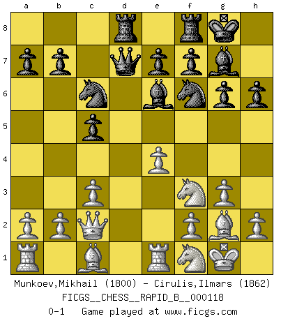 Last move : 0-1 2009 July 6 22:1:36 [Event "FICGS__CHESS__RAPID_B__000118"] [Site "FICGS"] [Date "2009.03.29"] [Round "1"] [White "Munkoev,Mikhail"] [Black "Cirulis,Ilmars"] [Result "0-1"] [WhiteElo "1800"] [BlackElo "1862"] 1.Nf3 d5 2.g3 c5 3.Bg2 Nc6 4.O-O Nf6 5.d3 g6 6.Nbd2 Bg7 7.e4 dxe4 8.dxe4 O-O 9.Re1 Be6 10.c3 h6 11.Qc2 Qd7 12.Nf1 Rad8 0-1 This chess game has been lost on time (started : 2009.03.29 18:52:22) Reti : King's Indian attack Kingside Castling by player White (move 4) Kingside Castling by player Black (move 8) Player Black won this chess game. Follow this game move after move (download)I still hope to kill Fischer. (Boris Spassky) Die Arbeit ist etwas Unnatürliches. Die Faulheit allein ist göttlich. (Anatole France) El Ajedrez es un invernadero donde los frutos del carácter pueden madurar mas completamente que en la vida. (Edward Morgan Foster) Un millionnaire : 'Monsieur Steinitz ! Vous ne participez aux tournois que pour l'argent, alors que moi je n'y viens que pour l'honneur.' Steinitz : 'Chacun joue pour ce qu'il n'a pas'... If you work for a living, why do you kill yourself working ? (Tuco to a chicken in The Good, The Bad and The Ugly)