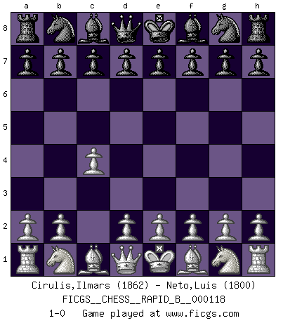 Last move : 1-0 2009 April 29 16:23:34 [Event "FICGS__CHESS__RAPID_B__000118"] [Site "FICGS"] [Date "2009.03.29"] [Round "1"] [White "Cirulis,Ilmars"] [Black "Neto,Luis"] [Result "1-0"] [WhiteElo "1862"] [BlackElo "1800"] 1.c4 1-0 This chess game has been lost on time (started : 2009.03.29 18:52:22) English Opening Player White won this chess game. Follow this game move after move (download)I like the moment when I break a man's ego. (Bobby Fischer) Ich habe Putins Aufstieg an die Macht beobachtet und seine Politik, die demokratischen Institutionen meines Landes zu zerstören. (Garry Kasparov) Si pudieramos observar el interior de la cabeza de un jugador de Ajedrez, encontraríamos ahí un mundo lleno de sentimientos, imágenes, ideas, emoción y pasión. (Alfred Binet) La vérité est comme le meilleur coup aux échecs : elle existe, mais il faut la chercher. (Arturo Perez-Reverte) The quality of decision is like the well-timed swoop of a falcon which enables it to strike and destroy its victim. (Sun Tzu)