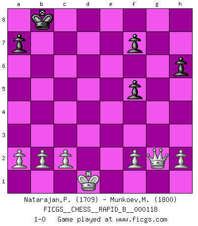 Last move : 1-0 2009 May 28 2:15:42 [Event "FICGS__CHESS__RAPID_B__000118"] [Site "FICGS"] [Date "2009.03.29"] [Round "1"] [White "Natarajan,Premraj"] [Black "Munkoev,Mikhail"] [Result "1-0"] [WhiteElo "1709"] [BlackElo "1800"] 1.e4 e6 2.d4 d5 3.Nc3 c5 4.exd5 exd5 5.Bb5+ Nc6 6.dxc5 d4 7.Qe2+ Be6 8.Ne4 Nf6 9.Bg5 h6 10.Bxf6 gxf6 11.O-O-O f5 12.Nd6+ Bxd6 13.cxd6 Qxd6 14.Nf3 O-O-O 15.Bxc6 bxc6 16.Rxd4 Qc7 17.Rhd1 Bd5 18.Qa6+ Kb8 19.Ne5 Rhe8 20.Nxc6+ Bxc6 21.Rxd8+ Rxd8 22.Rxd8+ Qxd8 23.Qxc6 Qg5+ 24.Kd1 Qxg2 25.Qxg2 1-0 French : Marshall variation Queenside Castling by player White (move 11) Queenside Castling by player Black (move 14) Player White won this chess game. Follow this game move after move (download)Fischer is under obligation to nobody. (Joseph Platz) Man gibt nur Pakete auf. (Paul Keres) Durante una competencia de Ajedrez, un Maestro de Ajedrez deberá ser una combinación de presa de caza y un Monge. (Alexander Alekhine) Mon pion favori sur ma case favorite ! Bronstein en parlant d'un coup de pion en h5 quand il avait les Noirs. To send light into the darkness of men's hearts - such is the duty of the artist. (Schumann)
