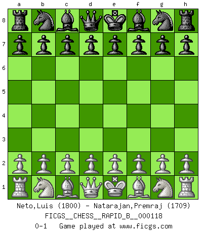 Last move : 0-1 2009 April 29 4:21:57 [Event "FICGS__CHESS__RAPID_B__000118"] [Site "FICGS"] [Date "2009.03.29"] [Round "1"] [White "Neto,Luis"] [Black "Natarajan,Premraj"] [Result "0-1"] [WhiteElo "1800"] [BlackElo "1709"] 0-1 This chess game has been lost on time (started : 2009.03.29 18:52:22) Player Black won this chess game. Follow this game move after move (download)Excellence at Chess is one mark of a scheming mind. (Sir Arthur Conan Doyle) Bis jetzt ist Weiß einer wohlbekannten Analyse gefolgt. Aber jetzt begeht er einen schrecklichen Fehler: Er beginnt seinen eigenen Kopf zu benutzen. (Siegbert Tarrasch) Ser exitoso en el Ajedrez te permite descubrir tu propia personalidad. Eso es lo que deseo para los niños de mi clase. (Saudin Robovic) Les échecs sont utiles à l'exercice de la faculté de penser et à celle de l'imagination. Car nous devons posséder une méthode élaborée pour atteindre des buts partout où nous devons conduire notre raison. (Leibnitz) Gambling is the son of avarice and the father of despair. (French proverb)