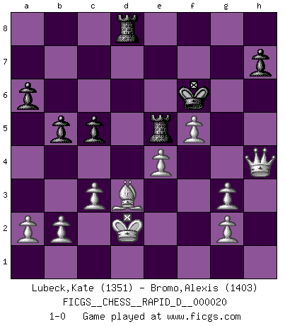 Last move : 1-0 2009 April 19 10:8:32 [Event "FICGS__CHESS__RAPID_D__000020"] [Site "FICGS"] [Date "2009.03.30"] [Round "1"] [White "Lubeck,Kate"] [Black "Bromo,Alexis"] [Result "1-0"] [WhiteElo "1351"] [BlackElo "1403"] 1.Nc3 e5 2.d4 Nc6 3.e3 Nf6 4.Qe2 Bd6 5.f4 Bb4 6.Bd2 Bxc3 7.Bxc3 d6 8.O-O-O Ne4 9.Rd3 Bf5 10.dxe5 Ng3 11.hxg3 Bxd3 12.Qxd3 d5 13.f5 f6 14.exf6 gxf6 15.Rh6 Kf7 16.Bxf6 Qxf6 17.Rxf6+ Kxf6 18.Qxd5 Rad8 19.Qc4 a6 20.Nf3 Rhe8 21.Qf4 Ne5 22.Nxe5 Rxe5 23.e4 Rd4 24.Bd3 b5 25.Kd2 c5 26.c3 Rd8 27.Qh4+ 1-0 Dunst (Sleipner-Heinrichsen) Opening Queenside Castling by player White (move 8) Player White won this chess game. Follow this game move after move (download)Place the contents of the Chess box in a hat, shake them up vigorously, pour them on the board from a height of two feet, and you get the style of Steinitz. (H. E. Bird) Nicht daß Diemer aus Opportunismus Mitglied der NSDAP geworden wäre. Er war ein Fanatiker, in allem, was er tat. (Hans Ree) La mitad de las variaciones que son calculadas en una partida de torneo, resultan ser completamente superfluas. Desafortunadamente, nadie sabe por adelantado cual mitad. (Jan Tinman) Les échecs, c'est l'art d'analyser. (Mikhail Botvinnik) As a goal marker shodan is important. As a destination it is a poor place to stop. (Thomas Tamayo)