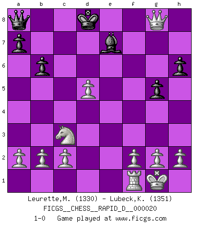 Last move : 1-0 2009 April 20 22:33:28 [Event "FICGS__CHESS__RAPID_D__000020"] [Site "FICGS"] [Date "2009.03.30"] [Round "1"] [White "Leurette,Marc-Antoine"] [Black "Lubeck,Kate"] [Result "1-0"] [WhiteElo "1330"] [BlackElo "1351"] 1.e4 d5 2.exd5 Qxd5 3.Nc3 Qf5 4.Nf3 Qe6+ 5.Be2 Nc6 6.d4 Na5 7.Bf4 Bd7 8.Bxc7 b6 9.Qd3 Qc6 10.Bf4 Nf6 11.Nh4 g6 12.Bf3 Qc8 13.Bxa8 Qxa8 14.O-O h6 15.Be5 g5 16.Nf5 Bxf5 17.Qxf5 Nc6 18.Bxf6 exf6 19.Qxf6 Rg8 20.Rae1+ Kd7 21.Qxf7+ Ne7 22.d5 Rg7 23.Qf6 Rg6 24.Qf7 Kd6 25.Rxe7 Bxe7 26.Qxg6+ Kd7 27.Qe6+ Kd8 28.Qg8+ 1-0 Scandinavian (centre counter) defense Kingside Castling by player White (move 14) Player White won this chess game. Follow this game move after move (download)When you don't know what to do, wait for your opponent to get an idea - it's sure to be wrong. (Tarrasch) Auf jeden Fall musst du zuerst Rechtsanwalt werden, damit du deine eigenen Interessen und die deiner Familie vertreten kannst. [Brief an seinen Sohn] (José Raúl Capablanca) Yo no le temo a Spassky. Todos saben que yo soy el mejor. Uno no necesita un torneo para probarlo. (Bobby Fischer) Si rien de grave n'est détecté lors de l'analyse d'une position, on joue alors le coup. Seconde règle de Blumenfeld. Everything in life is luck. (Donald Trump)