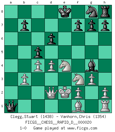 Last move : 1-0 2009 May 30 18:52:29 [Event "FICGS__CHESS__RAPID_D__000020"] [Site "FICGS"] [Date "2009.03.30"] [Round "1"] [White "Clegg,Stuart"] [Black "Vanhorn,Chris"] [Result "1-0"] [WhiteElo "1438"] [BlackElo "1354"] 1.d4 e6 2.c4 Bb4+ 3.Bd2 a5 4.Bxb4 axb4 5.e3 d6 6.Nf3 b3 7.Qxb3 Nc6 8.Qc2 Nb4 9.Qd2 Rxa2 10.Rxa2 Nxa2 11.b3 Nb4 12.Qxb4 c5 13.Qd2 e5 14.Nc3 exd4 15.exd4 Qa5 16.Ne4 Qa1+ 17.Qd1 Qa5+ 18.Qd2 Qa1+ 19.Ke2 Bg4 20.g3 1-0 This chess game has been lost on time (started : 2009.03.30 19:31:56) Queen's pawn : Franco-Indian (Keres) defense Player White won this chess game. Follow this game move after move (download)Chess is played with the mind and not with the hands ! (Renaud and Kahn) Ich verstehe Aljechins Kombinationen ganz gut; aber woher er diese Angriffschancen bekommt und wie er die Eröffnung behandelt das ist für mich ein Buch mit sieben Siegeln. (Rudolf Spielmann) Evita las multitudes. Haz independientemente tu propio razonamiento. Trata de ser el jugador de Ajedrez, no la pieza de Ajedrez. (Ralph Charell) Les écrivains ont utilisé les échecs pour analyser les côtés extrêmes de la nature humaine. Dans ce cadre, les échecs offrent un champ d'expérimentation idéal. Mais on pourrait faire la même chose avec la peinture. Et là, en vous référant à Van Gogh, vous ne tirerez pas de conclusion définitive sur les peintres. (Gary Kasparov) Wisdom doesn't necessarily come with age. Sometimes age just shows up all by itself. (Tom Watson)