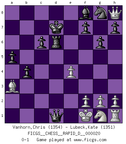 Last move : 0-1 2009 April 17 19:57:13 [Event "FICGS__CHESS__RAPID_D__000020"] [Site "FICGS"] [Date "2009.03.30"] [Round "1"] [White "Vanhorn,Chris"] [Black "Lubeck,Kate"] [Result "0-1"] [WhiteElo "1354"] [BlackElo "1351"] 1.e3 Nc6 2.Qf3 d6 3.Bc4 Be6 4.b3 Bxc4 5.bxc4 e5 6.Na3 Qf6 7.Nb5 O-O-O 8.Bb2 a6 9.Nc3 Nb4 10.Rc1 Qe6 11.Nd5 Nxa2 12.e4 Nxc1 13.Bxc1 c6 14.Ne3 b5 15.Nf5 a5 16.Qh5 g6 17.Qg5 Qxc4 18.Nxd6+ Rxd6 19.Qxe5 Kd7 20.Ba3 b4 21.Qxh8 Qxc2 22.Ke2 Qd3+ 23.Ke1 Qxd2+ 24.Kf1 Qd1+ 0-1 Van't Kruijs Opening Queenside Castling by player Black (move 7) Player Black won this chess game. Follow this game move after move (download)I am still a victim of Chess. It has all the beauty of art and much more. It cannot be commercialized. Chess is much purer than art in its social position. (Marcel Duchamp) Es ist nicht das erste mal, dass sich die FIDE dem Arabischen Geld gebeugt hat (über die FIDE WM 2004 in Lybien). (Larry Evans) Te sientas frente a un tablero y repentinamente tu corazón brinca. Tu mano tiembla al tomar una pieza y moverla. Pero lo que el Ajedrez te enseña es que tu debes permanecer ahí con calma y pensar de que si realmente es una buena idea o de que si hay otras ideas mejores. (Stanley Kubrick) Nous vivons dans un monde échiquéen : chaque jour qui passe est un défi à relever. (Philosophe Sasha) Art is not a thing, it is a way. (Elbert Hubbard)