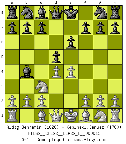 Last move : 0-1 2006 November 11 16:8:45 [Event "FICGS__CHESS__CLASS_C__000012"] [Site "FICGS"] [Date "2006.09.07"] [Round "1"] [White "Aldag,Benjamin"] [Black "Kepinski,Janusz"] [Result "0-1"] [WhiteElo "1826"] [BlackElo "1700"] 1.e4 e6 2.Nc3 d5 3.d4 Bb4 0-1 French defense Player Black won this chess game. Follow this game move after move (download)I like to say that Bobby Fischer was the greatest player ever. But what made Fischer a genius was his ability to blend an American freshness and pragmatism with Russian ideas about strategy. (Bruce Pandolfini) Vom Schach wurde gesagt das Leben sei dafür nicht lange genug. Aber das ist der Fehler des Lebens, nicht des Schach'. (Irving Chernev) Alekhine es un poeta que crea un trabajo de arte de algo que raramente inspiraría a otra persona a mandar una tarjeta postal. (Max Euwe) Le moment que je préfère le plus dans une rencontre, c'est celui où je sens que la personnalité de l'adversaire se brise. (Robert Fischer) SEO proverb : Make your website optimized for human beings, not for search engines.