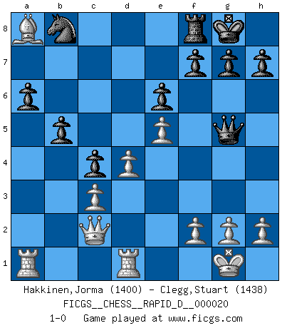 Last move : 1-0 2009 May 11 13:59:31 [Event "FICGS__CHESS__RAPID_D__000020"] [Site "FICGS"] [Date "2009.03.30"] [Round "1"] [White "Hakkinen,Jorma"] [Black "Clegg,Stuart"] [Result "1-0"] [WhiteElo "1400"] [BlackElo "1438"] 1.d4 d5 2.c4 c6 3.Nf3 Nf6 4.Nc3 dxc4 5.e4 b5 6.e5 Nd5 7.Be2 Nxc3 8.bxc3 e6 9.O-O Be7 10.a4 a6 11.axb5 cxb5 12.Be3 Bb7 13.Qc2 O-O 14.Rfd1 Bxf3 15.Bxf3 Bg5 16.Bxg5 Qxg5 17.Bxa8 1-0 QGD Slav : Tolush-Geller gambit Kingside Castling by player White (move 9) Kingside Castling by player Black (move 13) Player White won this chess game. Follow this game move after move (download)Chess demands total concentration. (Bobby Fischer) Wenn du gegen Bobby spielst, ist es keine Frage von gewinnen oder verlieren. Es ist eine Frage des Überlebens. (Boris Vassilievich Spassky) Los libros de Ajedrez deben de usarse igual como usamos los anteojos: para mejorar la vista, aunque algunos jugadores los quieren usar como si ellos les otorgaran la vision. (José Raúl Capablanca) Les échecs sont utiles à l'exercice de la faculté de penser et à celle de l'imagination. Car nous devons posséder une méthode élaborée pour atteindre des buts partout où nous devons conduire notre raison. (Leibnitz) It's not enough to succeed. Others must fail. (Gore Vidal)