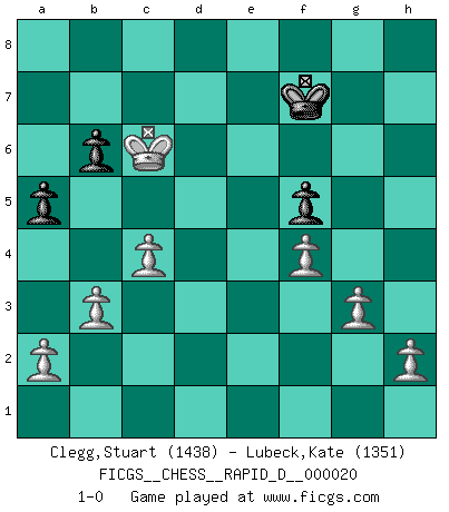 Last move : 1-0 2009 May 1 20:46:33 [Event "FICGS__CHESS__RAPID_D__000020"] [Site "FICGS"] [Date "2009.03.30"] [Round "1"] [White "Clegg,Stuart"] [Black "Lubeck,Kate"] [Result "1-0"] [WhiteElo "1438"] [BlackElo "1351"] 1.c4 e5 2.Nc3 Bb4 3.Nf3 Bxc3 4.dxc3 d6 5.c5 Na6 6.cxd6 Qxd6 7.Qxd6 cxd6 8.Nd2 Nf6 9.g3 b6 10.Bg2 Rb8 11.Nc4 O-O 12.Nxd6 Rd8 13.Nxc8 Rbxc8 14.Bg5 h6 15.Bxf6 gxf6 16.O-O Nc5 17.Rad1 f5 18.b3 Ne4 19.Bxe4 fxe4 20.f3 exf3 21.exf3 a5 22.c4 f5 23.Kg2 Rf8 24.Rd6 Rb8 25.Rxh6 Kg7 26.Rd6 Rf6 27.Rxf6 Kxf6 28.Rd1 e4 29.f4 e3 30.Re1 Re8 31.Kf3 e2 32.Rxe2 Rxe2 33.Kxe2 Kg6 34.Ke3 Kh5 35.Kd4 Kg6 36.Kd5 Kf7 37.Kc6 1-0 English, Kramnik-Shirov counterattack Kingside Castling by player Black (move 11) Kingside Castling by player White (move 16) Player White won this chess game. Follow this game move after move (download)What is the object of playing a gambit opening?... To acquire a reputation of being a dashing player at the cost of losing a game. (Siegbert Tarrasch) Immer nach dem besten Zug zu suchen ist ziemlich unpraktisch. (Nigel Short) Un buen sacrificio es aquel que aunque no sea necesariamente sólido, deja a tu oponente aturdido y confuso. (Rudolph Spielmann) Le profane ne songe pas à la somme de jouissance dont il se prive, qui méconnaît ce jeu aux ressources aussi variées que passionnantes. (Jean-Marie Jeanton-Lamarche) Being number two sucks. (Andre Agassi)