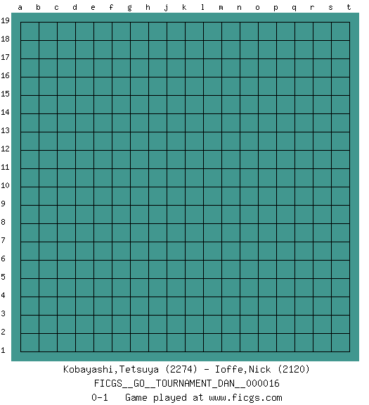 Last move : 0-1 2009 April 30 16:34:15 [Event "FICGS__GO__TOURNAMENT_DAN__000016"] [Site "FICGS"] [Date "2009.03.31"] [Round "1"] [Black "Kobayashi,Tetsuya"] [White "Ioffe,Nick"] [Result "0-1"] [Rating 1 "2274"] [Rating 2 "2120"] 0-1 This go game has been lost on time (started : 2009.03.31 9:29:52) Here are the names of the openings (joseki) played in the four corners : Player White won this Go (weiqi, baduk) game. Follow this game move after move (download)The weak player fears ko, the strong player seeks it. (Bill Taylor) The real danger is not that computers will begin to think like men, but that men will begin to think like computers. (Sydney J. Harris)