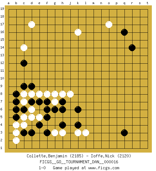 Last move : 1-0 2009 July 13 3:29:42 [Event "FICGS__GO__TOURNAMENT_DAN__000016 "] [Site "FICGS"] [Date "2009.03.31"] [Round "1"] [Black "Collette,Benjamin "] [White "Ioffe,Nick "] [Result "1-0"] [Rating 1 "2185"] [Rating 2 "2120"] 1.q16 d17 2.q3 c4 3.e4 g3 4.c3 b3 5.d3 d6 6.f5 k3 7.b5 b4 8.c6 c7 9.b7 c5 10.b6 c8 11.b8 d5 12.c9 e8 13.c12 c14 14.h4 h3 15.d9 g7 16.h6 j8 17.k4 l3 18.k6 o17 19.r14 k16 20.f7 f8 21.h7 h8 22.g6 g8 23.e7 d8 24.d7 e5 25.f6 b2 26.f3 1-0 Here are the names of the openings (joseki) played in the four corners : Corner d4 : c4 e4Komoku (Somok, Xiao~mu`) 3-4 Point. The komoku (3-4) point is the traditional corner enclosure move..Ikken Takagakari (Hankan Nop'dakeolch'im, Yi Gaogua`jiao~, 1-Space High Approach). The 5-4 approach move has become more popular in modern times, as modern Go emphasizes speed and influence. Corner d16 : d17 c12Komoku (Somok, Xiao~mu`) 3-4 Point. The komoku (3-4) point is the traditional corner enclosure move.. Corner q4 : q3 l3Komoku (Somok, Xiao~mu`) 3-4 Point. The komoku (3-4) point is the traditional corner enclosure move.. Corner q16 : q16 o17Hoshi (Hwajeom, Seongjeom, Xingwei`) 4-4 Point. The star or hoshi (4-4) point, emphasizing influence at the potential expense of territory.Ikken Kakari (Hankan Keolch'im, Yi Gua`jiao~, 1-Space Low Approach). White 2 is the standard approach move to the 4-4. Player Black won this Go (weiqi, baduk) game.Follow this game move after move (download ) Nothing requires doing this or that, but necessity exists. (Pierre Audouard) At work, the authority of a person is inversely proportional to the number of pens that person is carrying. (Dan Rotaru)